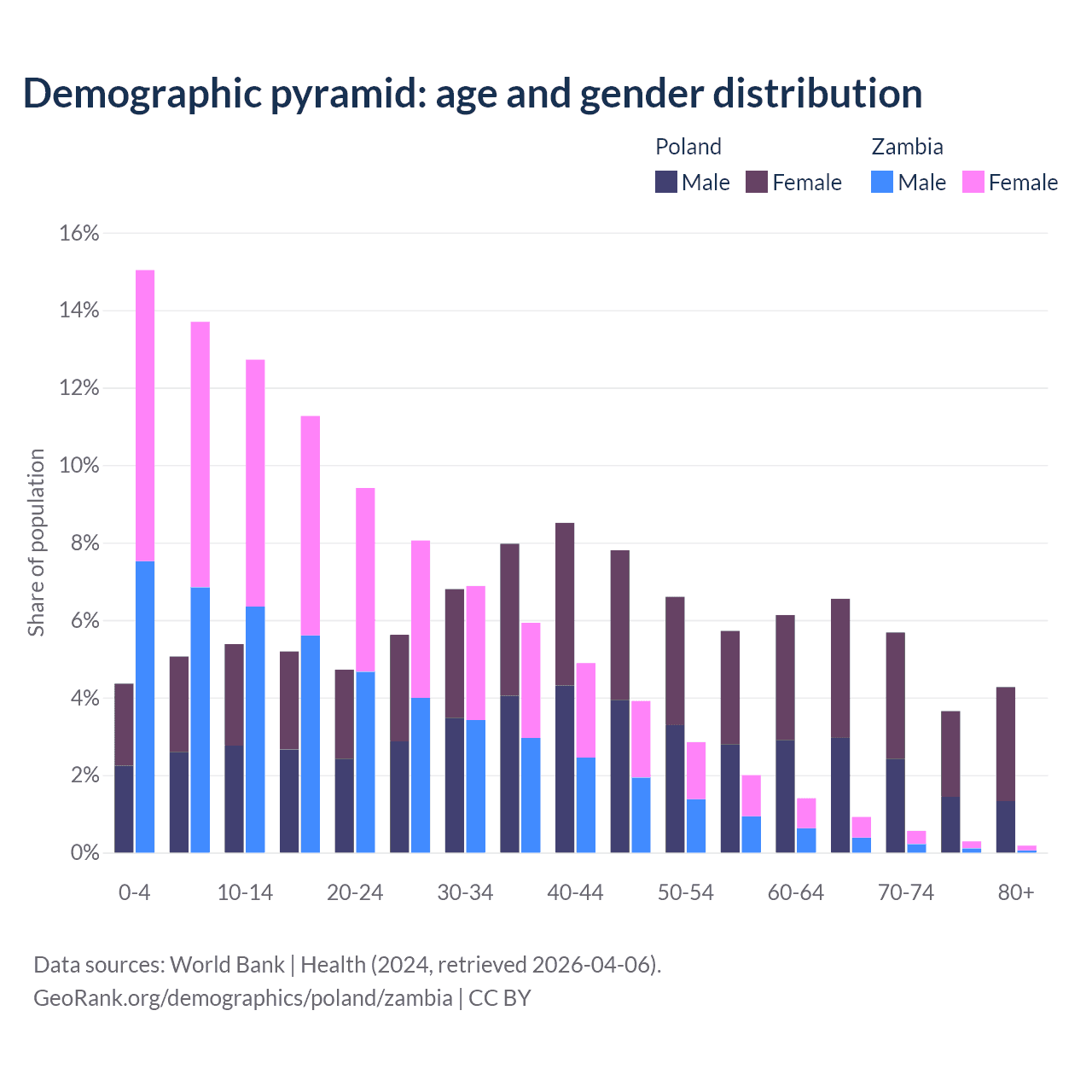 The share of older people aged 65 and over is 20.1% in Poland and 1.95% in Zambia. Life expectancy in Poland compared to Zambia .
