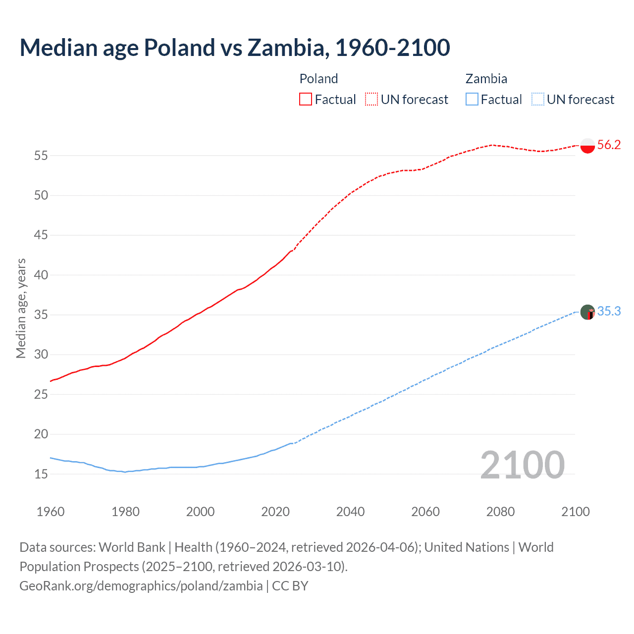 - The median age in Poland is 42.9 years compared to 18.8 years in Zambia.