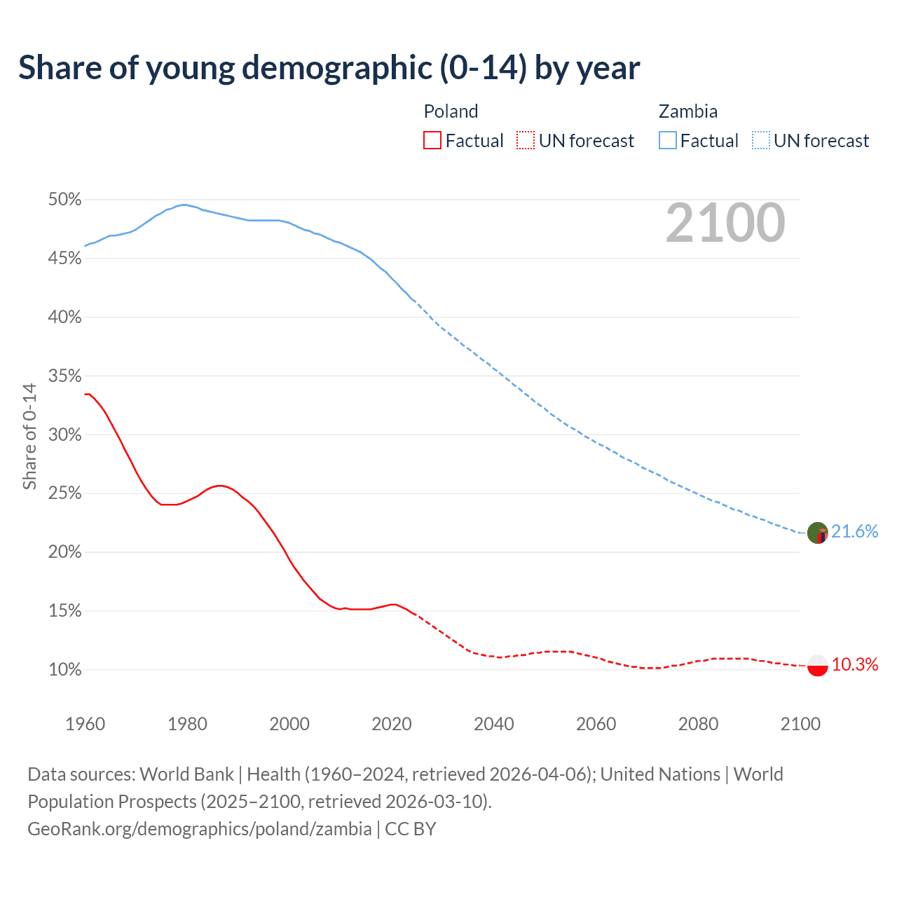 - The share of young demographic (0-15 years old) in Poland is 14.8% vs 41.5% in Zambia.