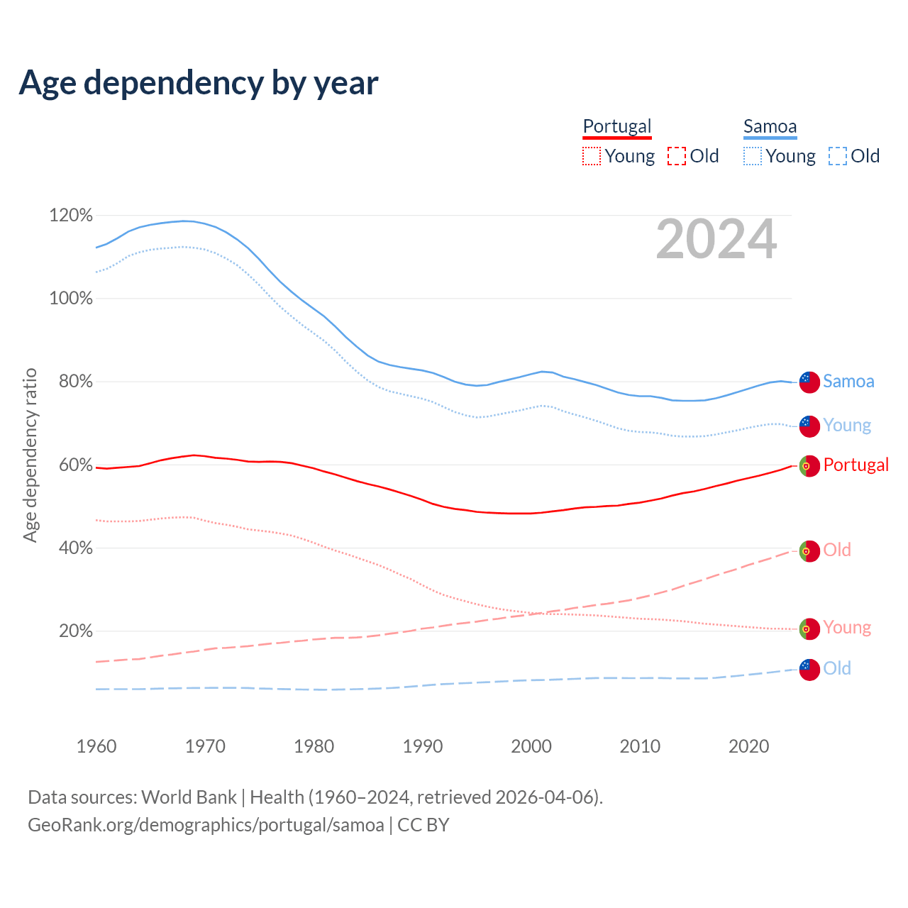 - The share of old-age demographic (65+) in Portugal is 24.5% vs 5.88% in Samoa.