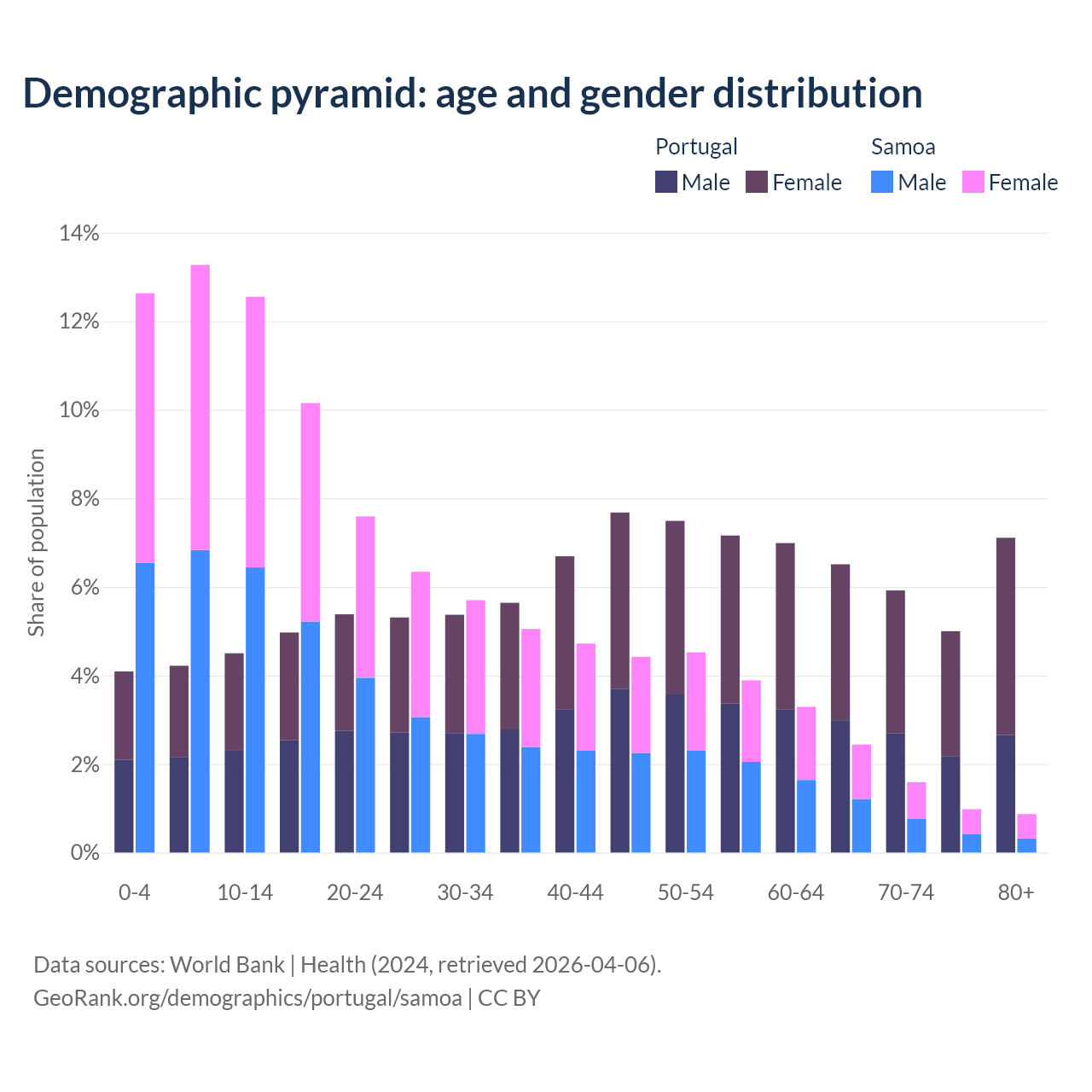 - Portugal is ranked 5/196 by median age (oldest to youngest) vs 158/196 for Samoa.