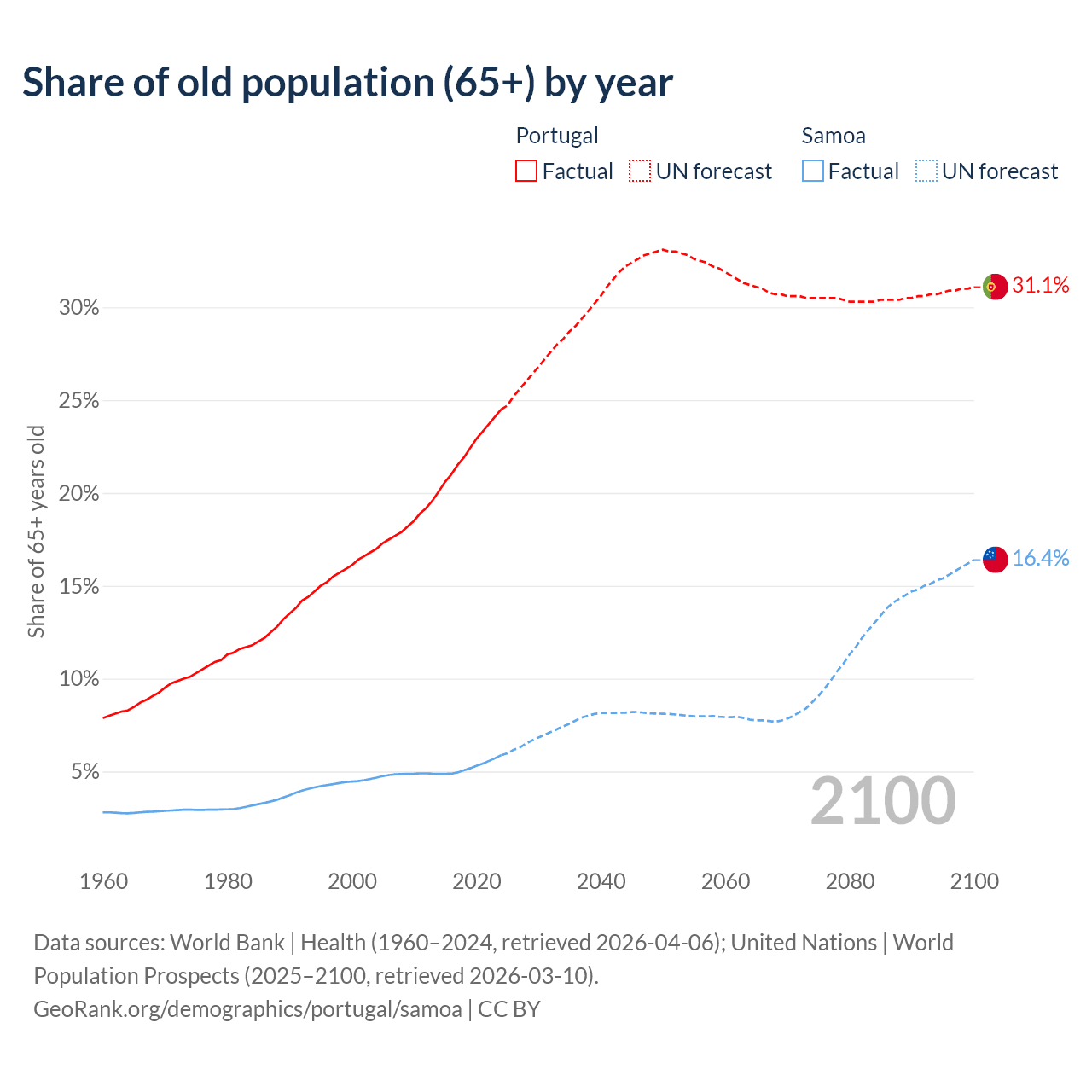 The share of older people aged 65 and over is 24.5% in Portugal and 5.88% in Samoa. Life expectancy in Portugal compared to Samoa .