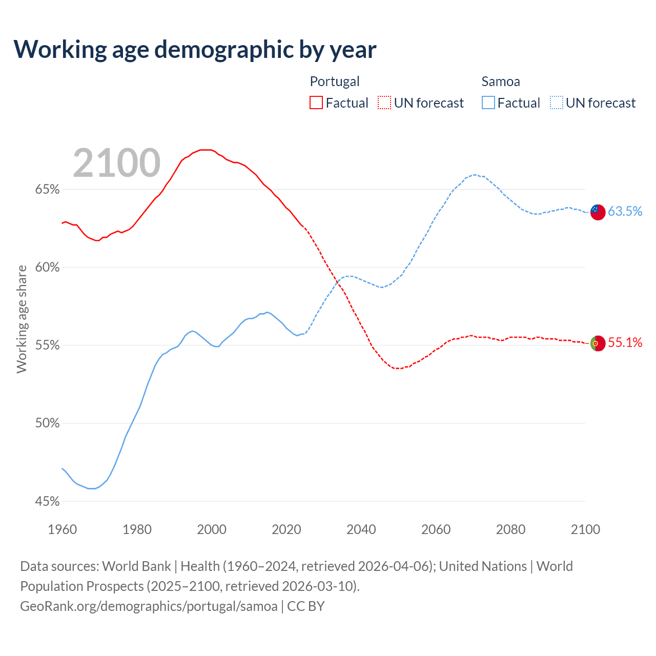 - Portugal has 6.68M working age adults (aged 15-64) vs 123K in Samoa.