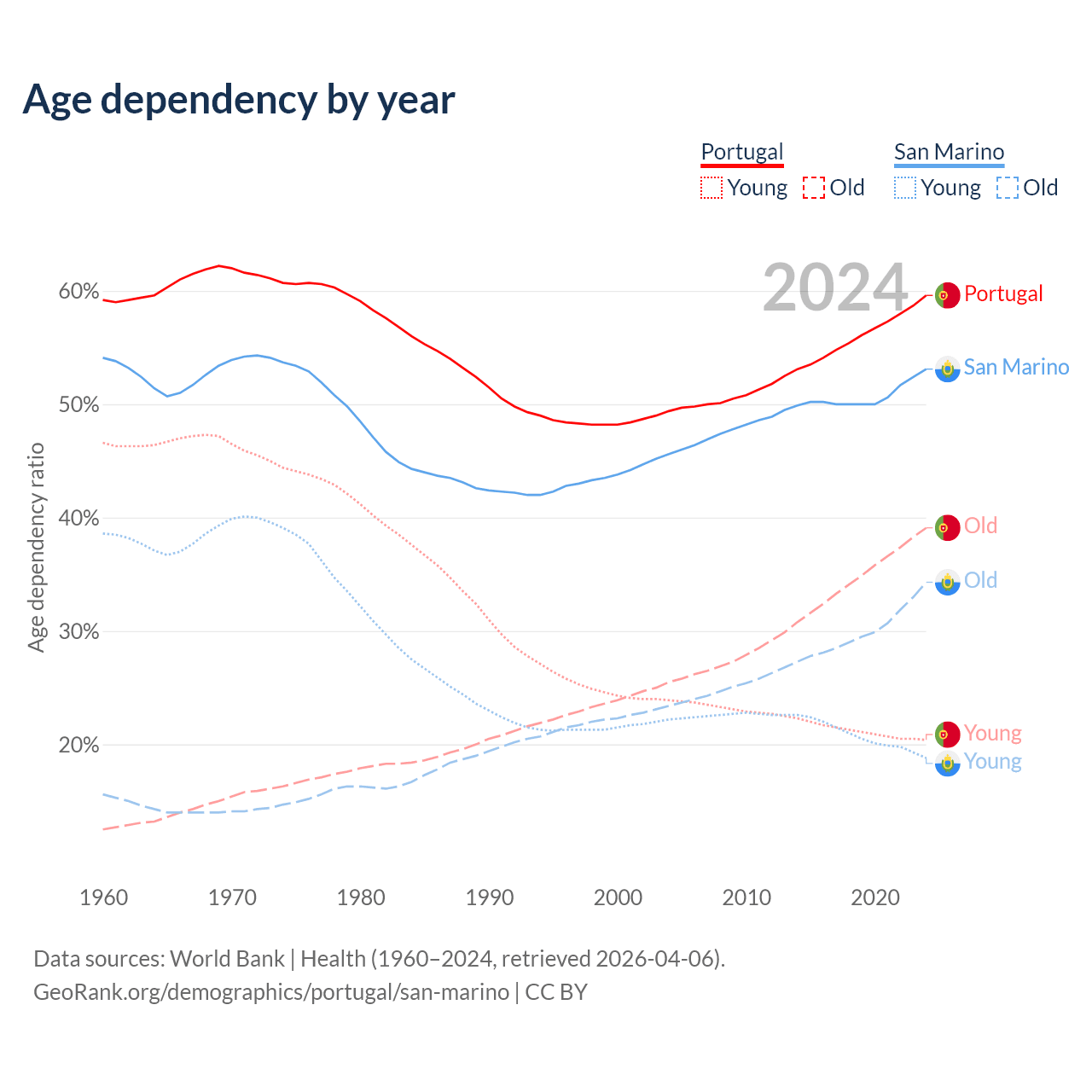 - Portugal is ranked 5/196 by median age (oldest to youngest) vs 3/196 for San Marino.