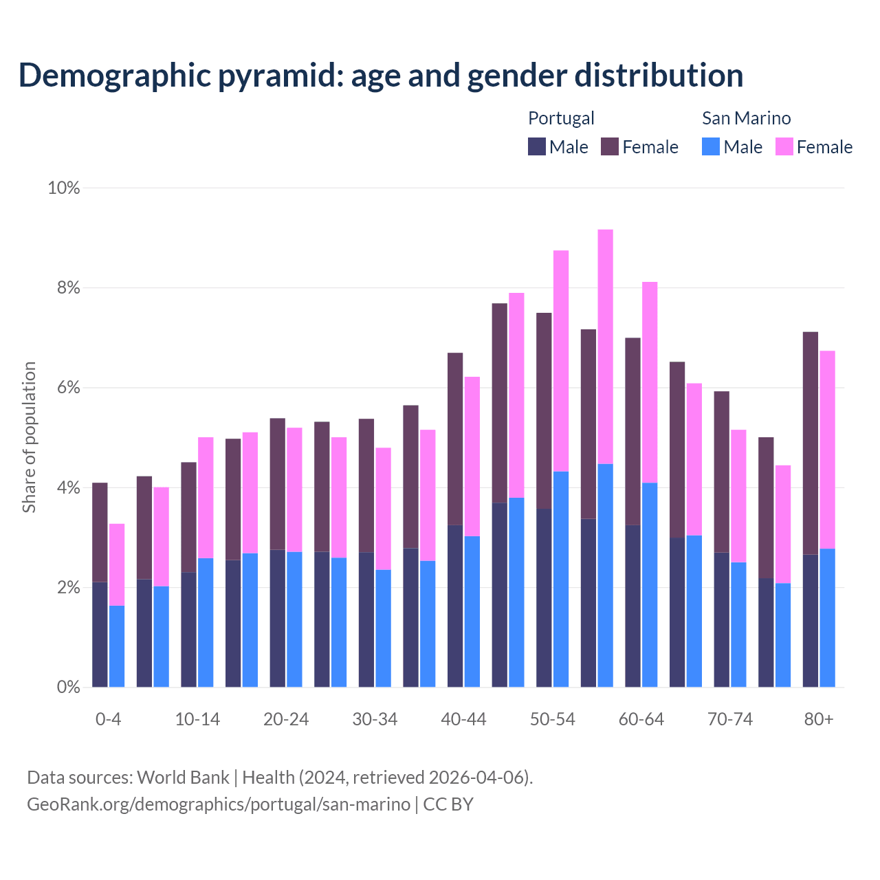 - As of 2026, the population of Portugal is 10.7M vs 34K in San Marino - 314 times difference.