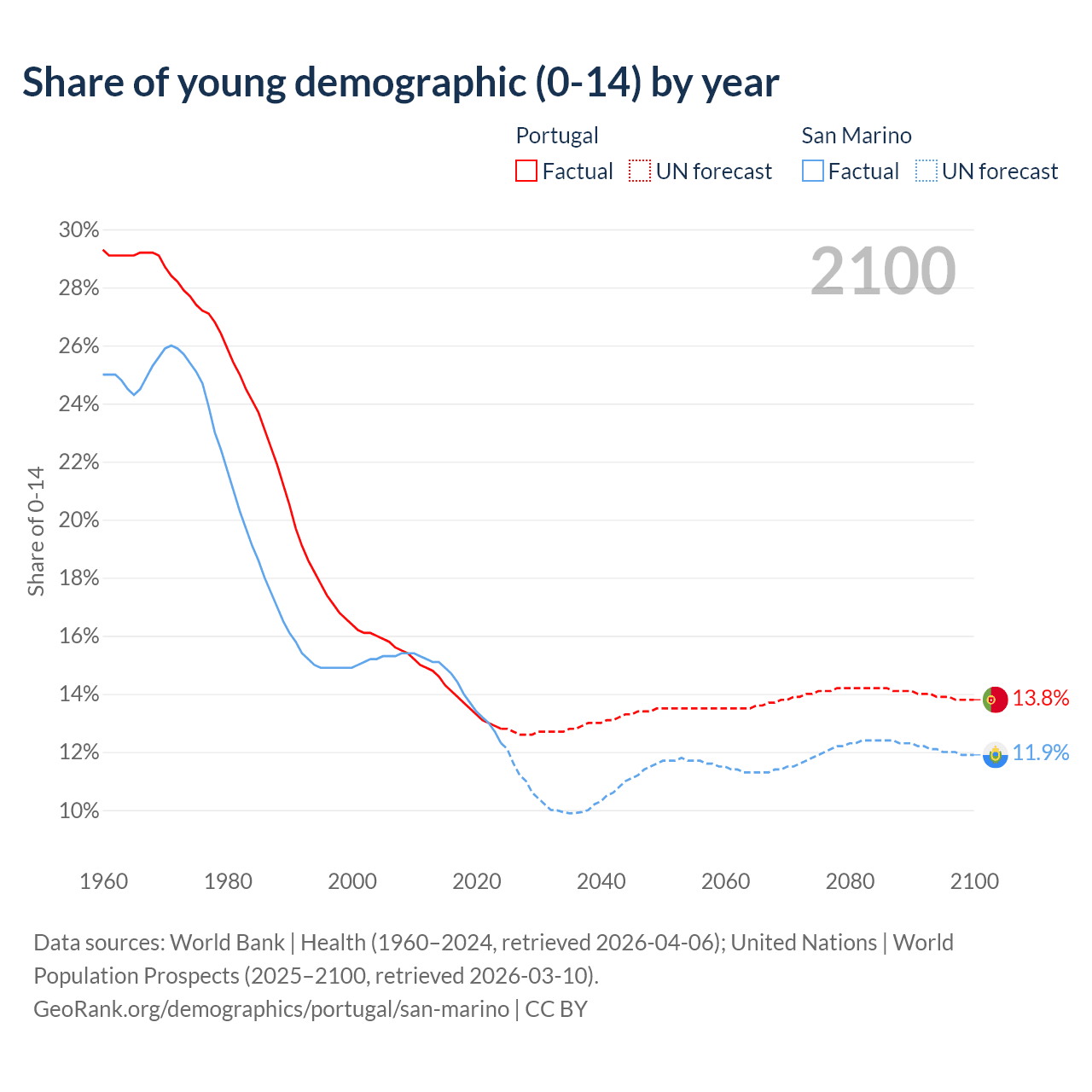 - The share of young demographic (0-15 years old) in Portugal is 12.8% vs 12.3% in San Marino.