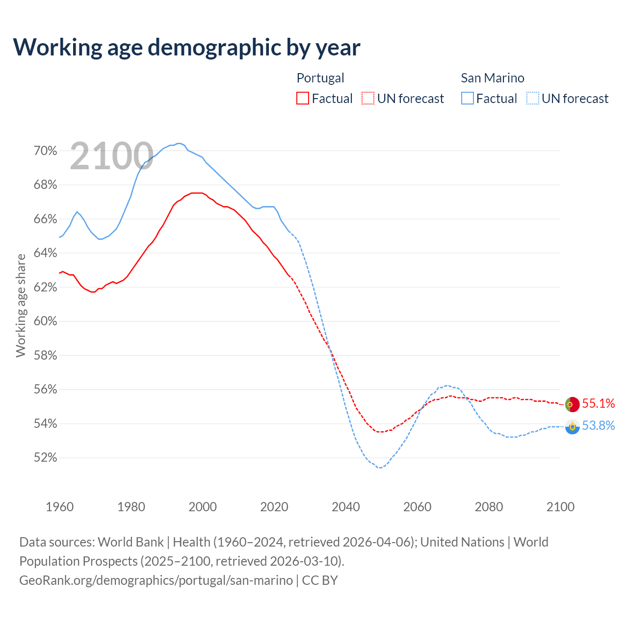 - Portugal has 6.68M working age adults (aged 15-64) vs 22.2K in San Marino.