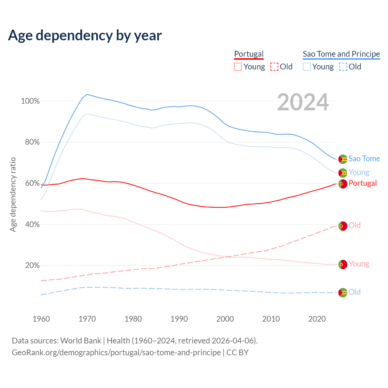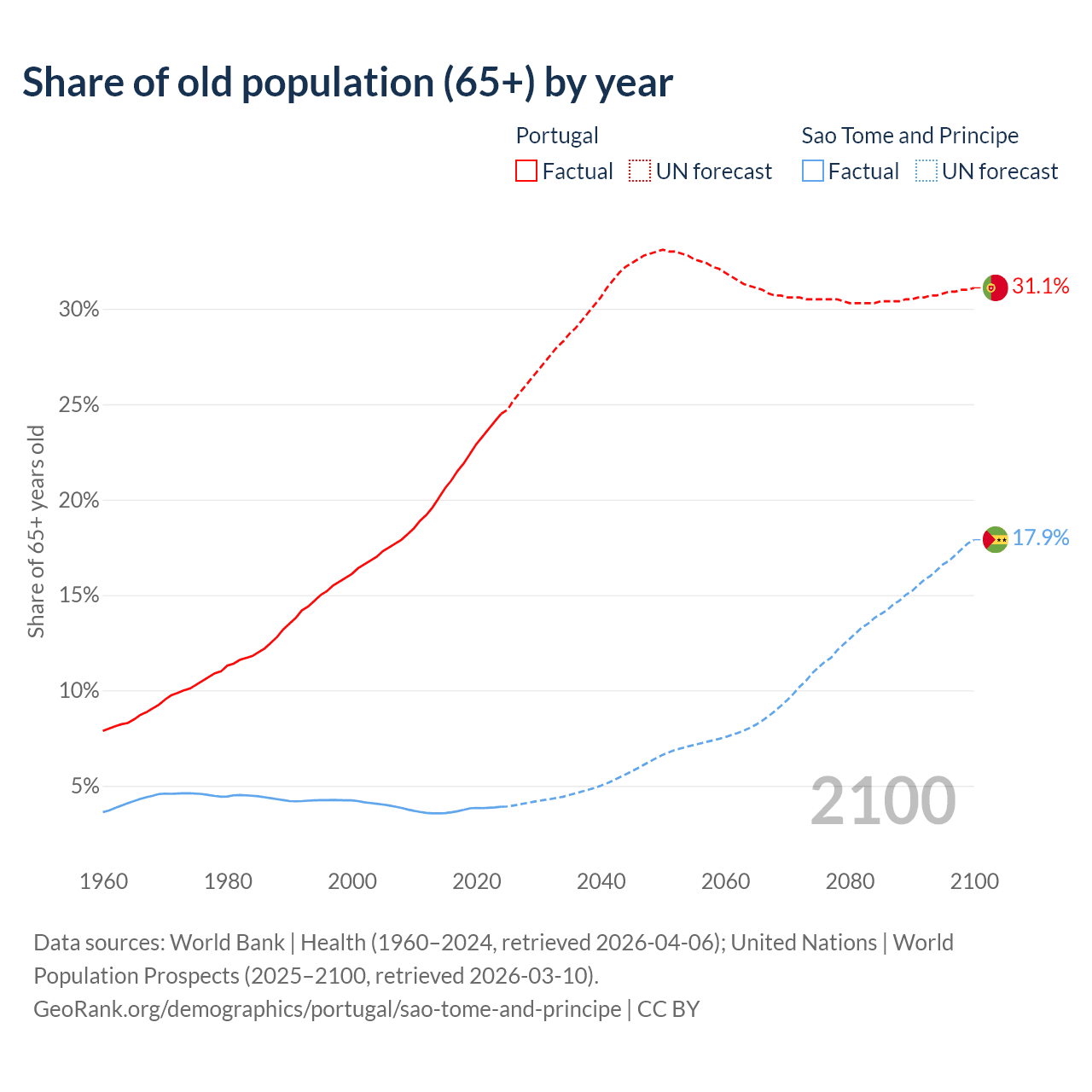 The share of older people aged 65 and over is 24.5% in Portugal and 3.9% in Sao Tome and Principe. Life expectancy in Portugal compared to Sao Tome and Principe .