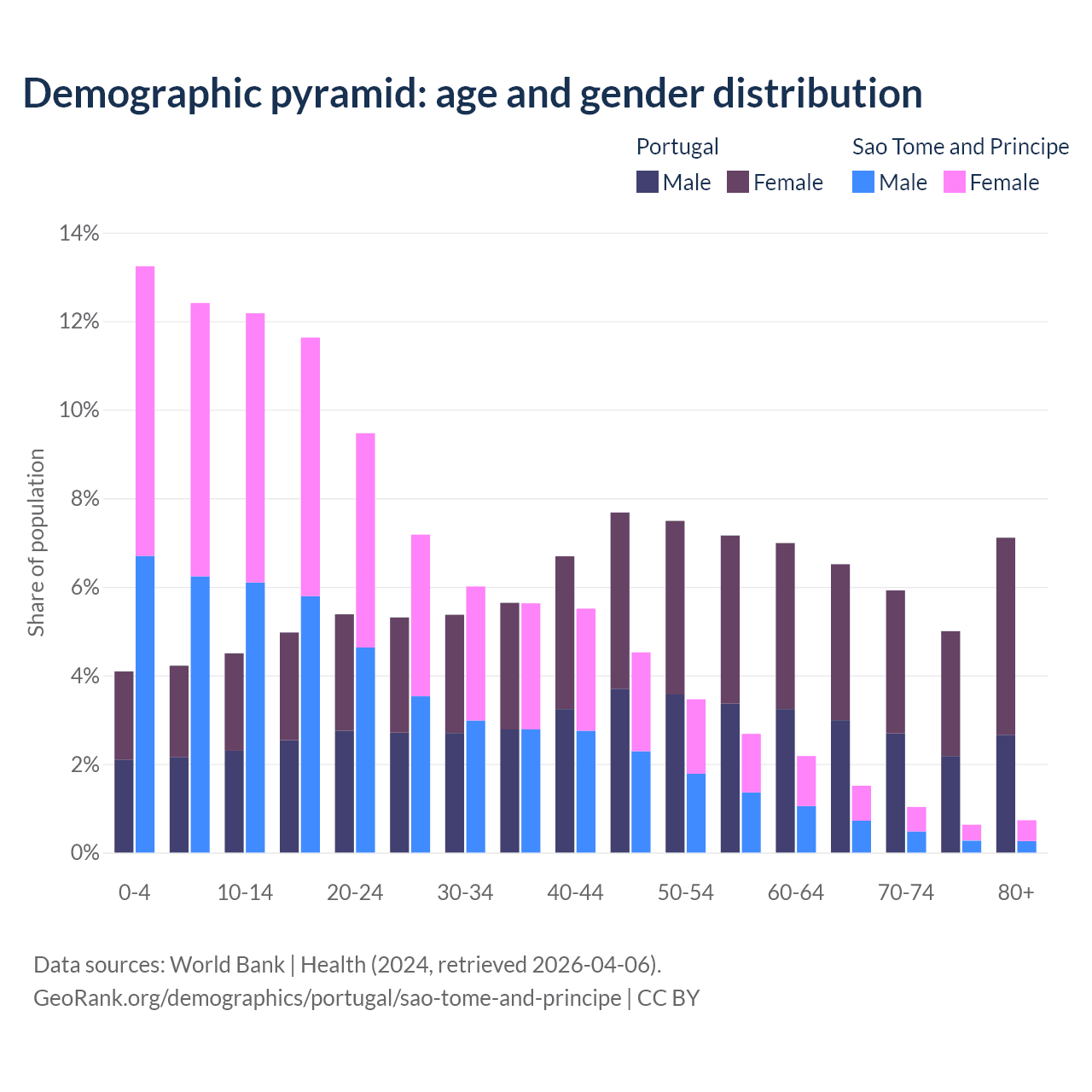 - As of 2026, the population of Portugal is 10.7M vs 246K in Sao Tome and Principe - 43.3 times difference.