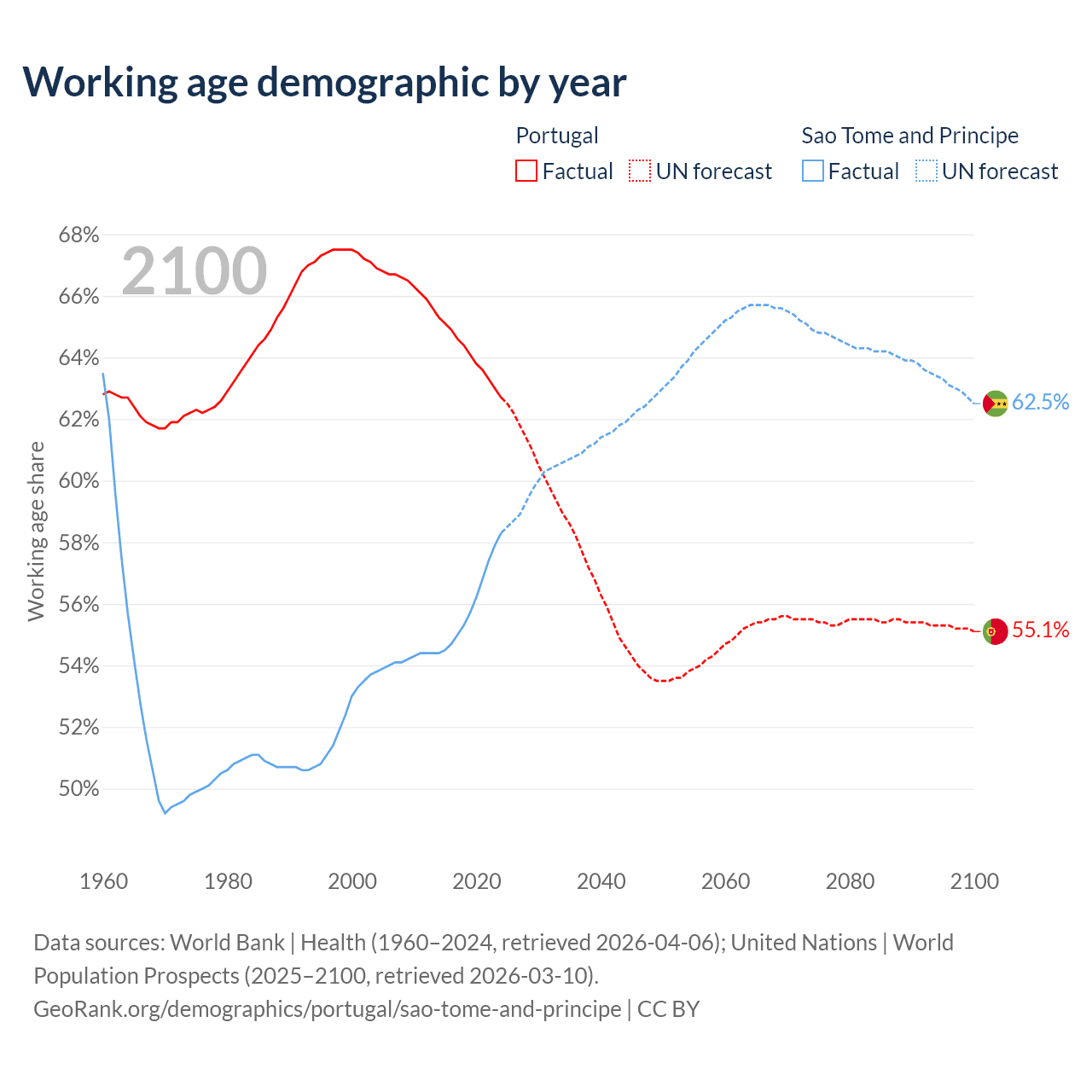 - Portugal has 6.68M working age adults (aged 15-64) vs 144K in Sao Tome and Principe.