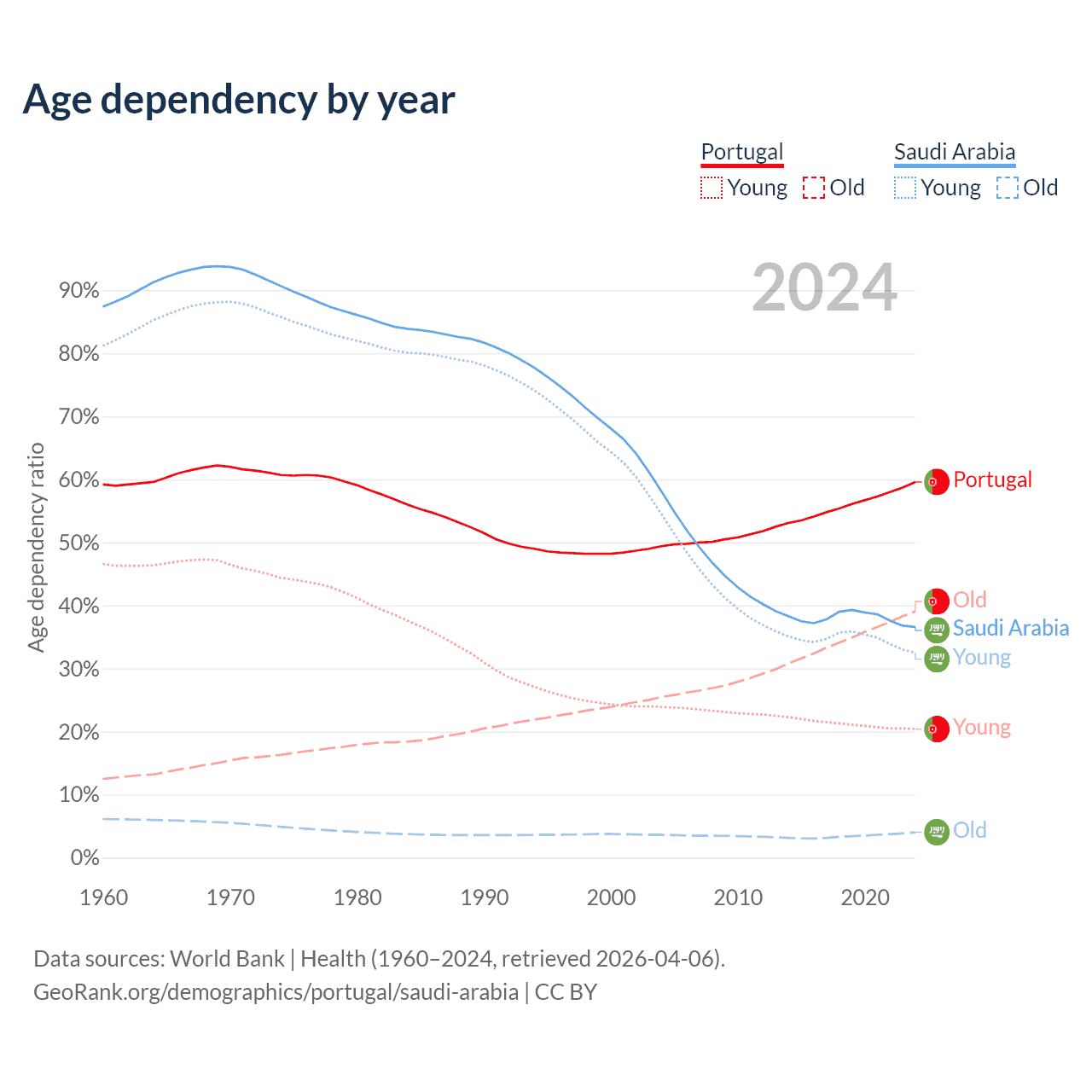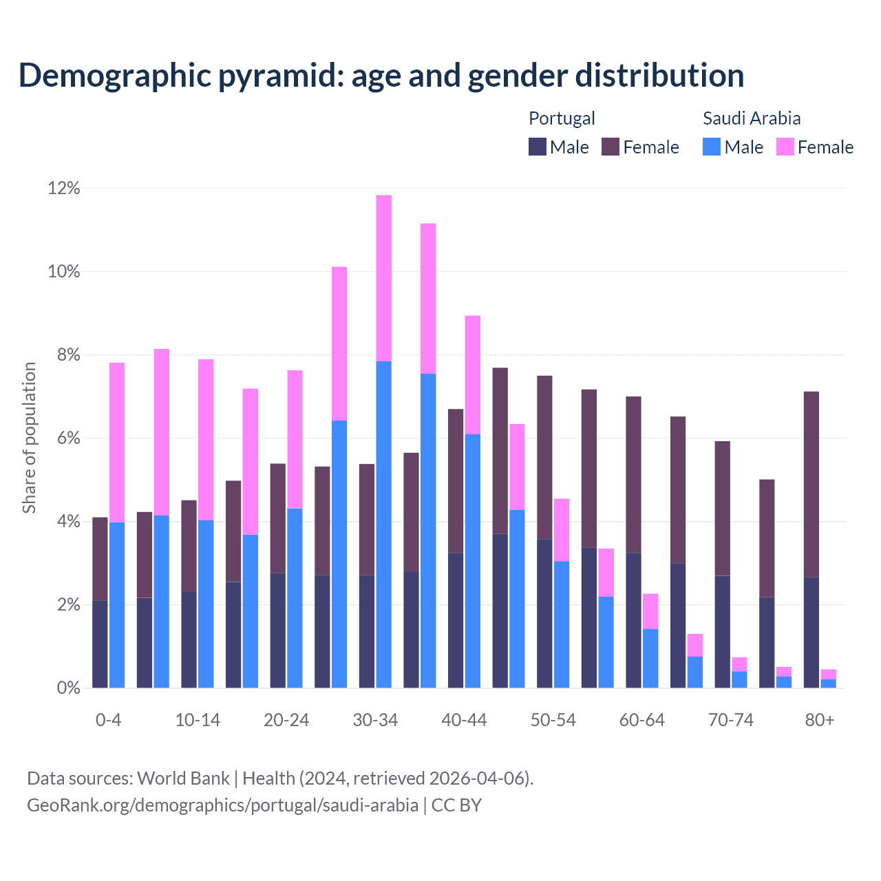 - Portugal is ranked 5/196 by median age (oldest to youngest) vs 98/196 for Saudi Arabia.