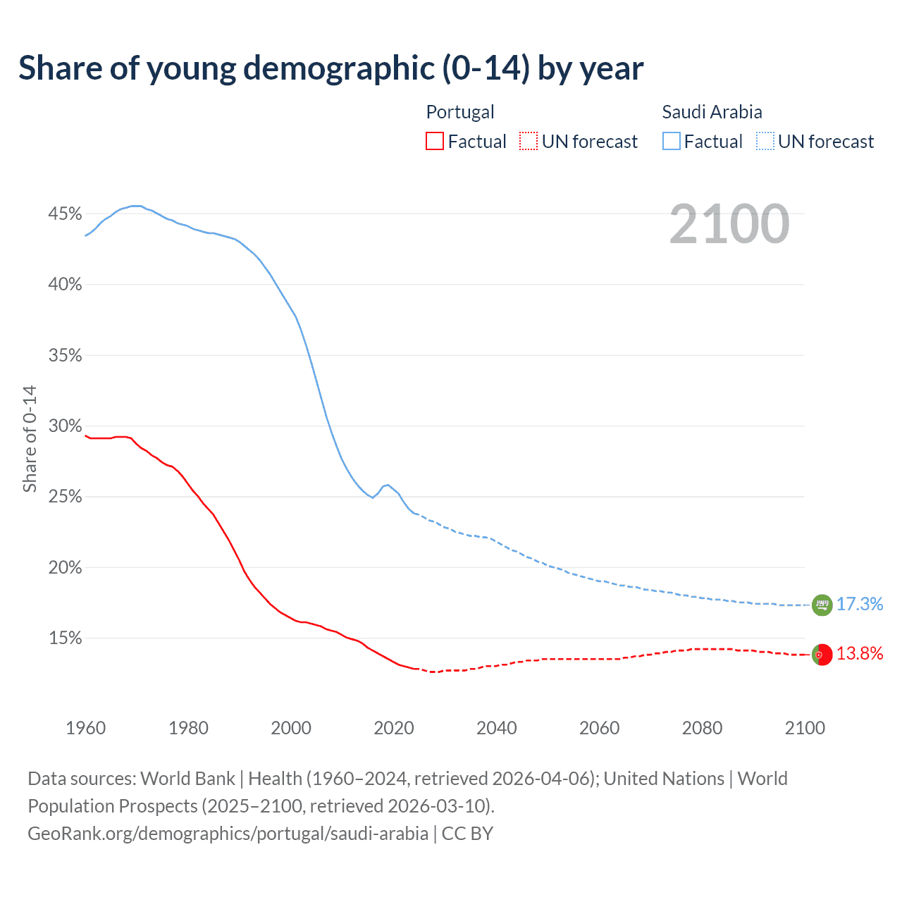 - The share of young demographic (0-15 years old) in Portugal is 12.8% vs 23.8% in Saudi Arabia.