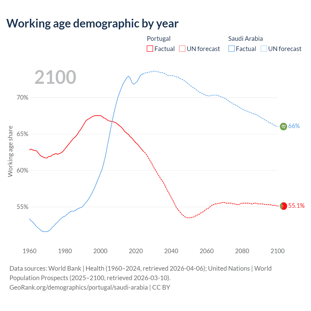- Portugal has 6.68M working age adults (aged 15-64) vs 26.9M in Saudi Arabia.