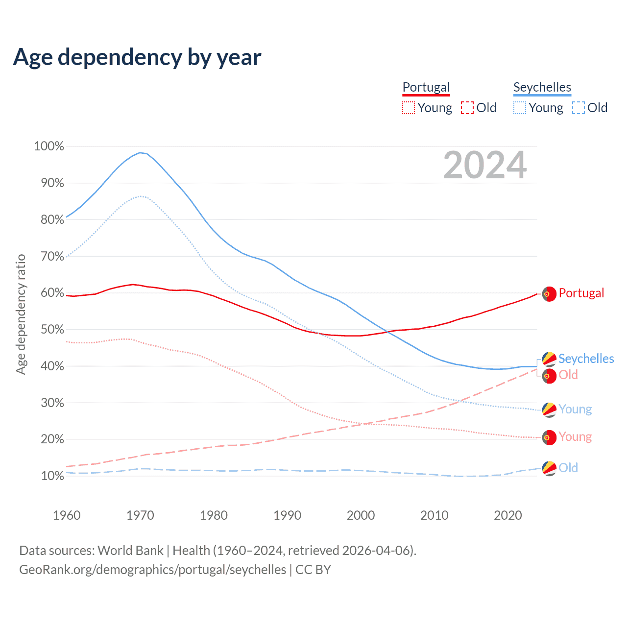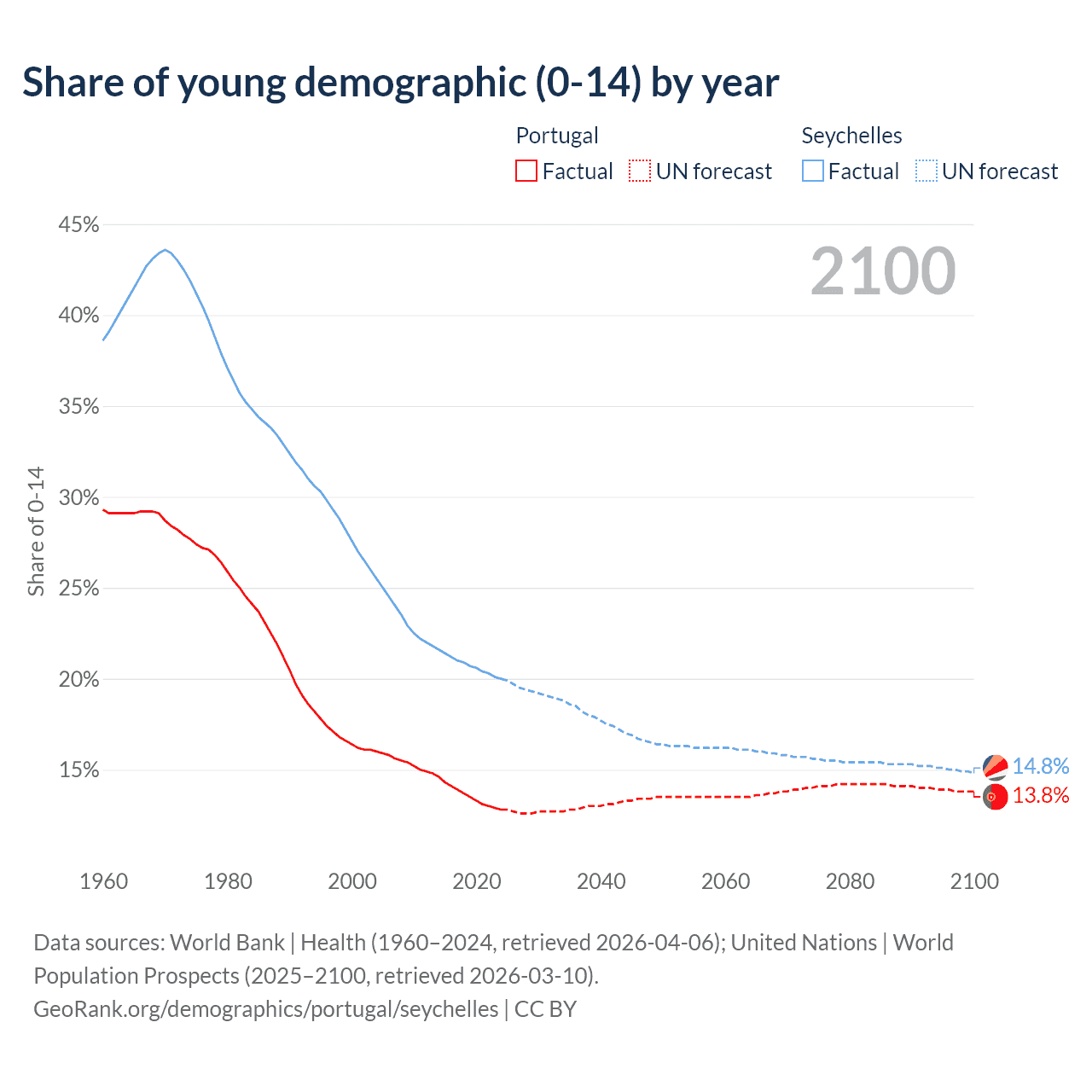 - The share of young demographic (0-15 years old) in Portugal is 12.8% vs 20% in the Seychelles.