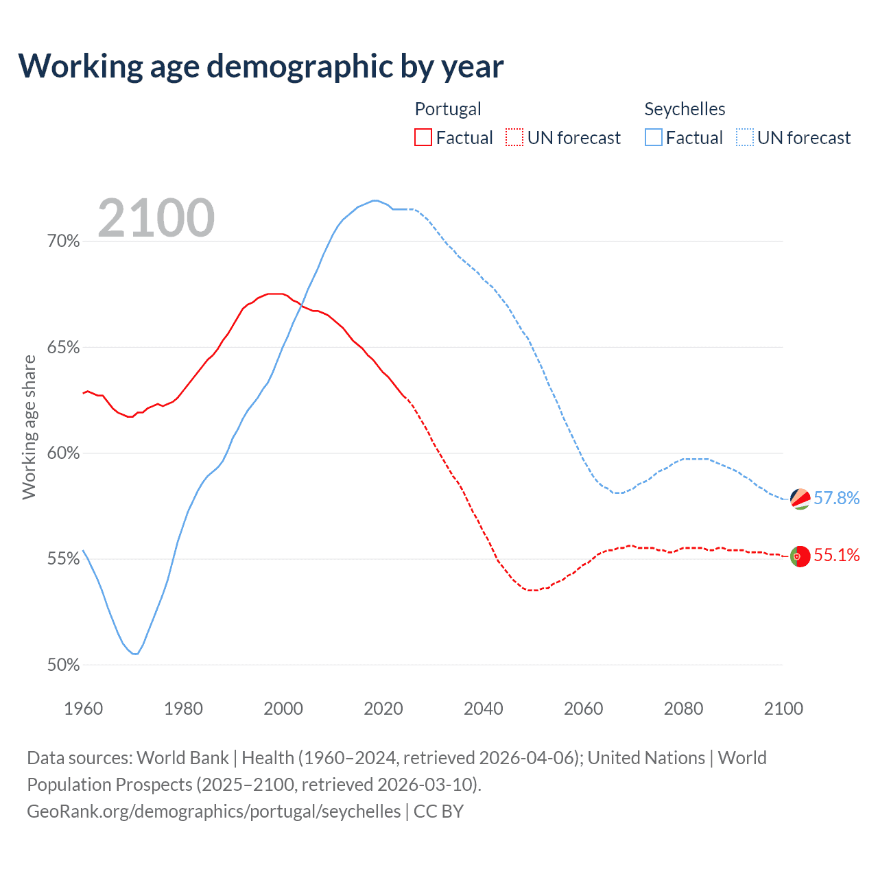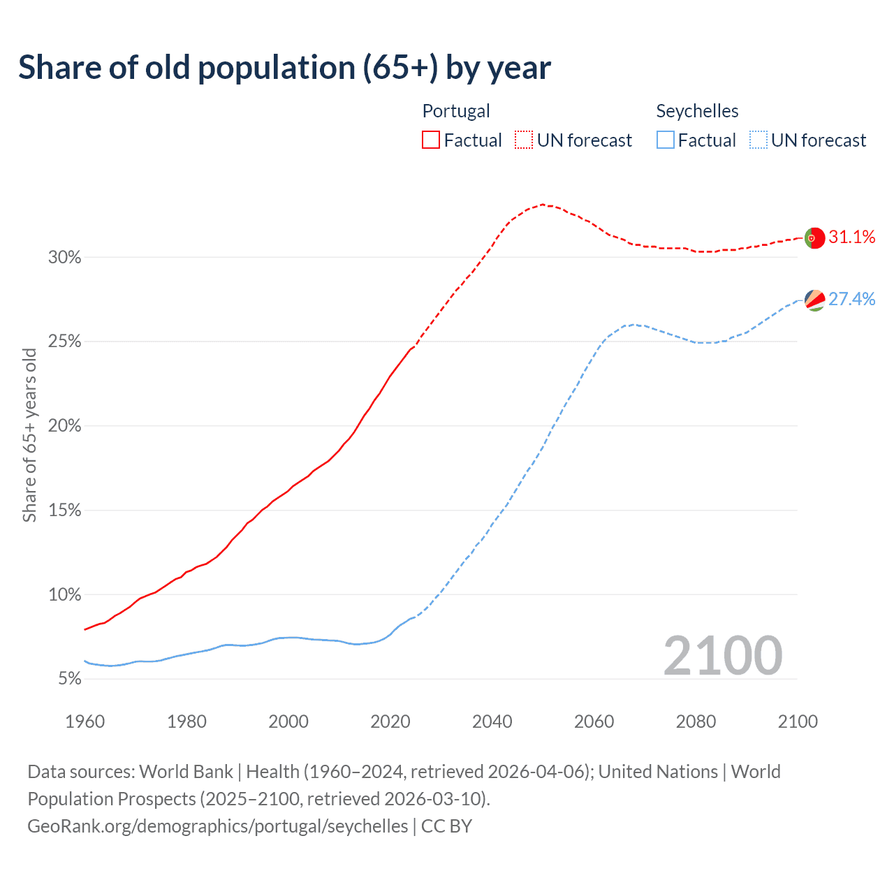 Median age Portugal vs Seychelles, 1960-2100