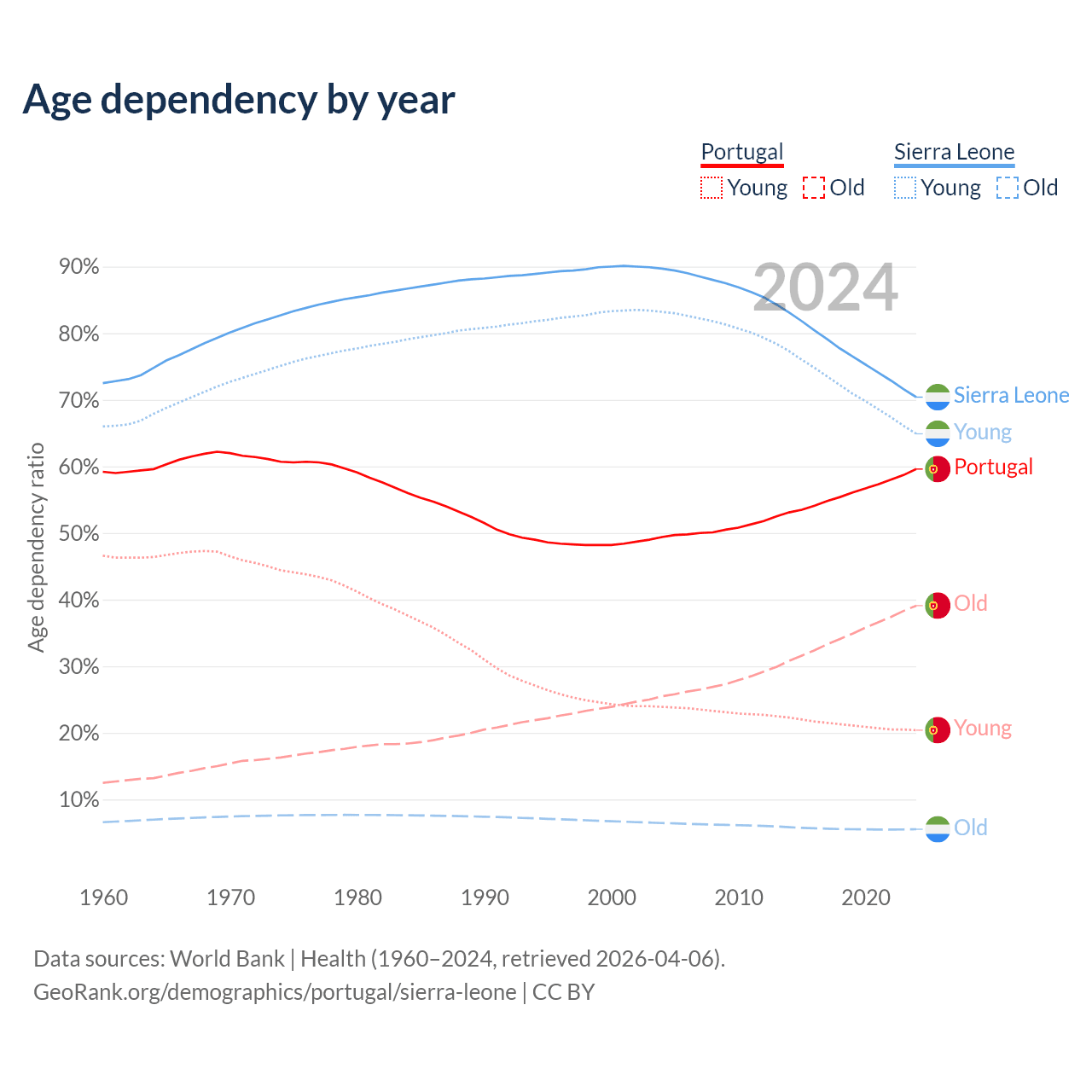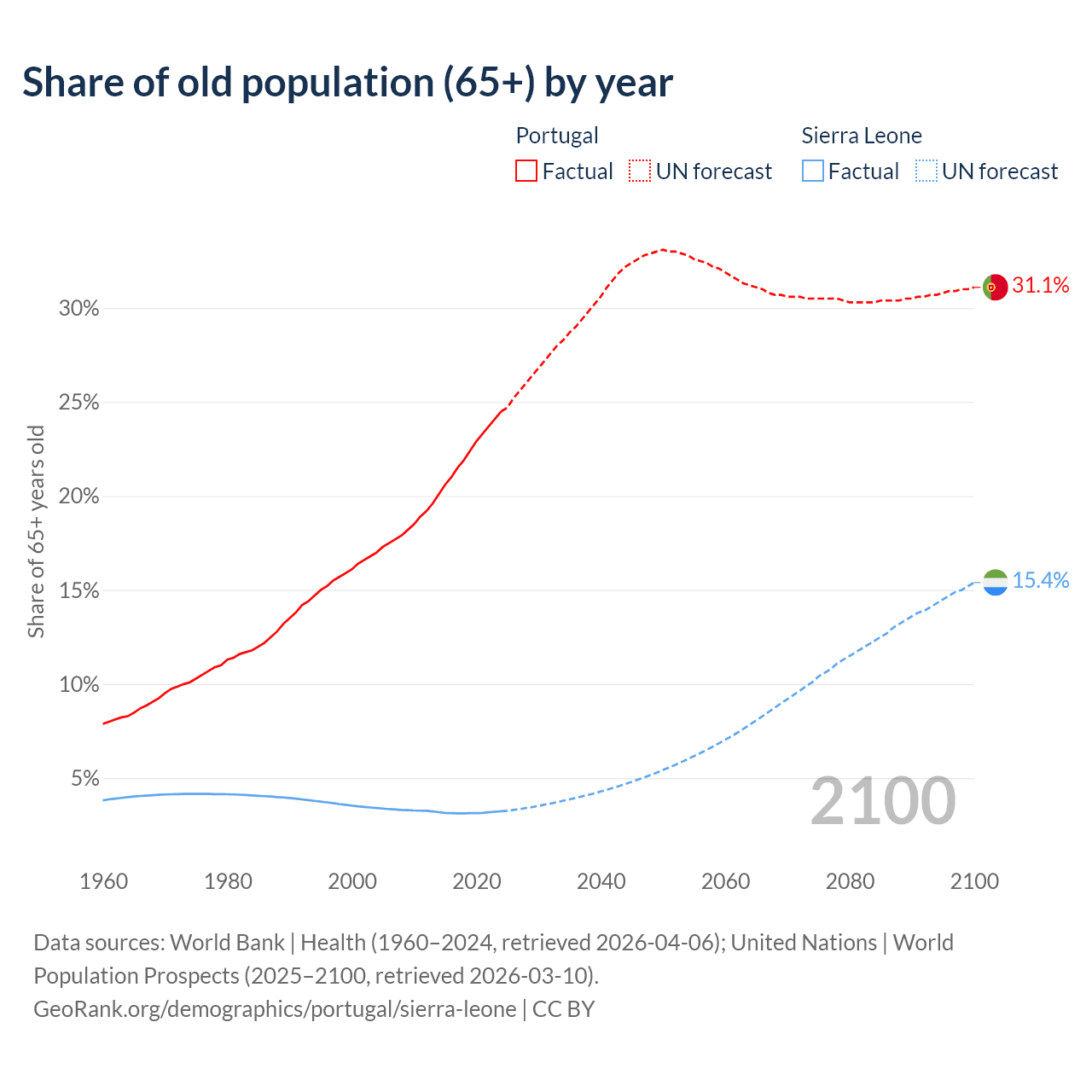 The share of older people aged 65 and over is 24.5% in Portugal and 3.24% in Sierra Leone. Life expectancy in Portugal compared to Sierra Leone .