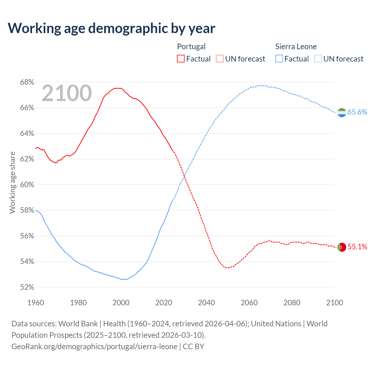 - Portugal has 6.68M working age adults (aged 15-64) vs 5.31M in Sierra Leone.