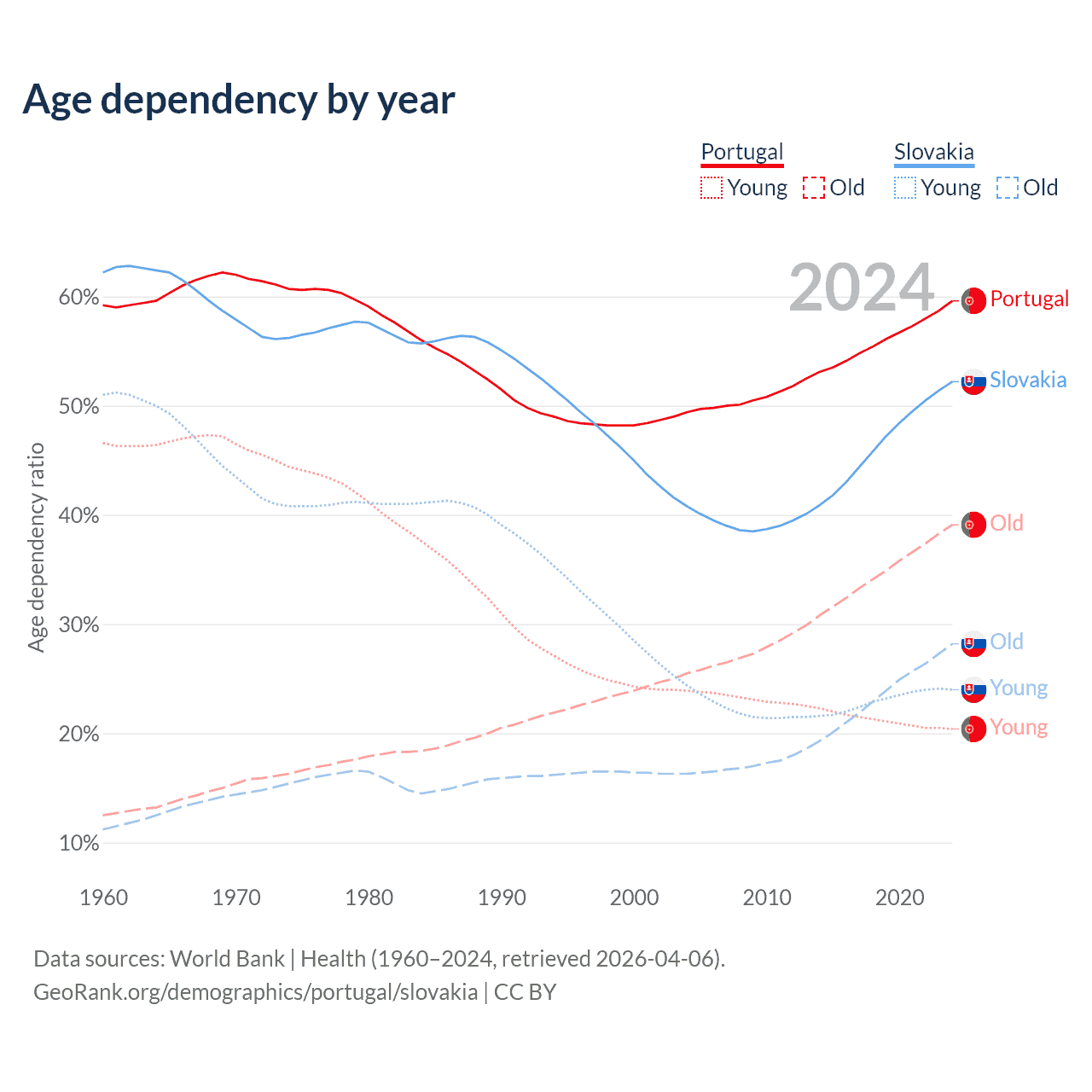 - Portugal is ranked 5/196 by median age (oldest to youngest) vs 31/196 for Slovakia.