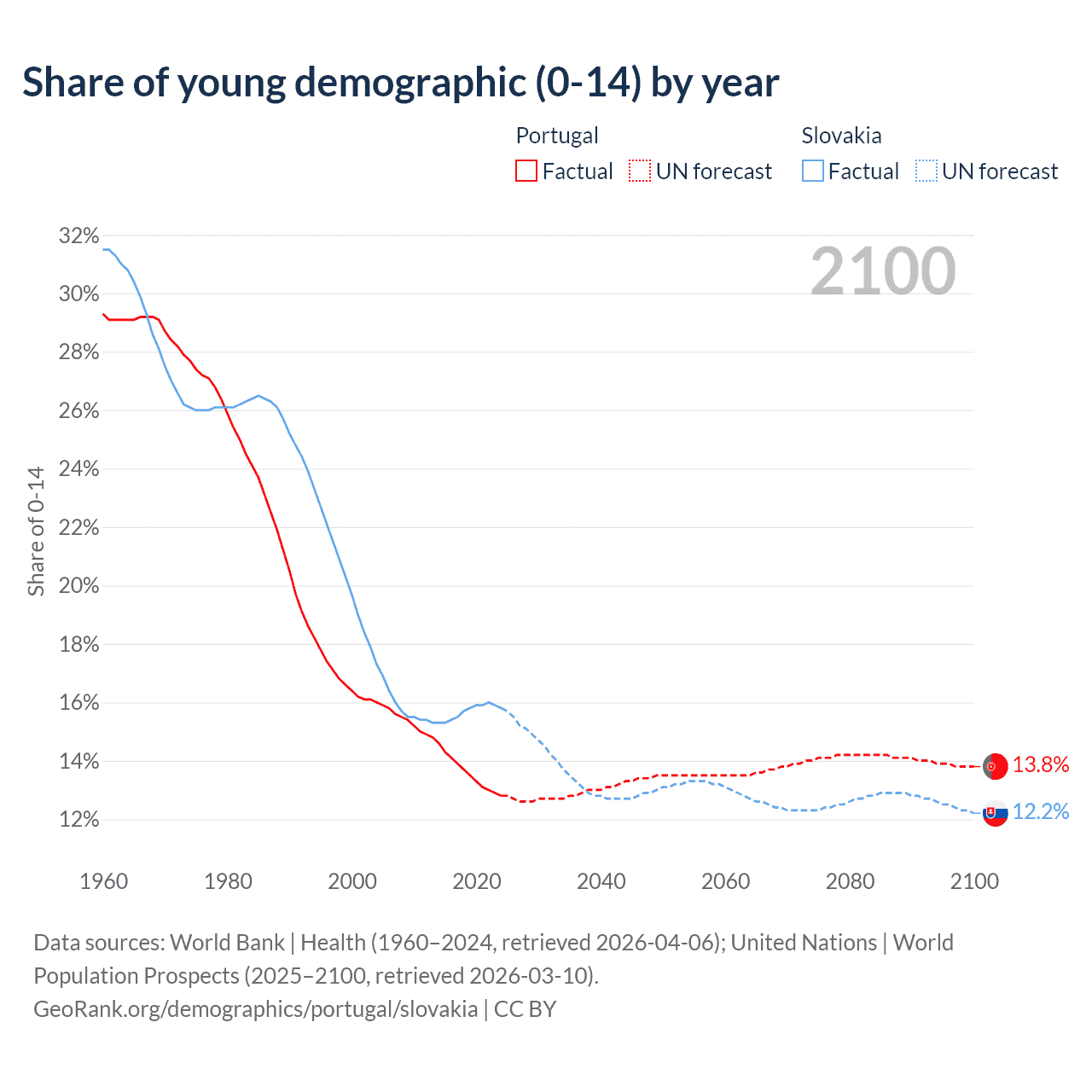 - The share of young demographic (0-15 years old) in Portugal is 12.8% vs 15.8% in Slovakia.