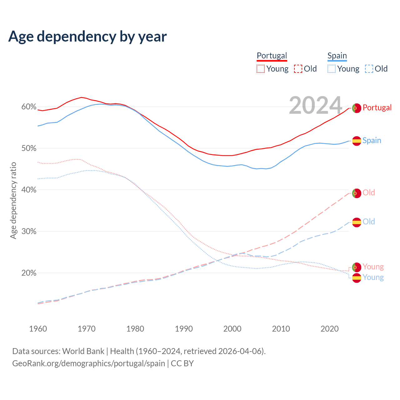 Data sources: World Bank | Health (1960–2024, retrieved 2026-04-06); U.S. Census Bureau (1960–2024, retrieved 2026-02-08).