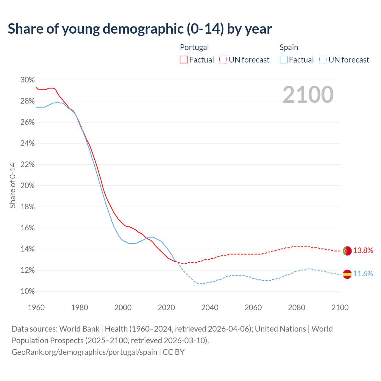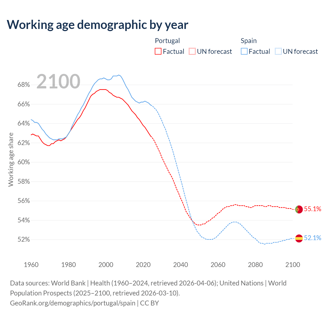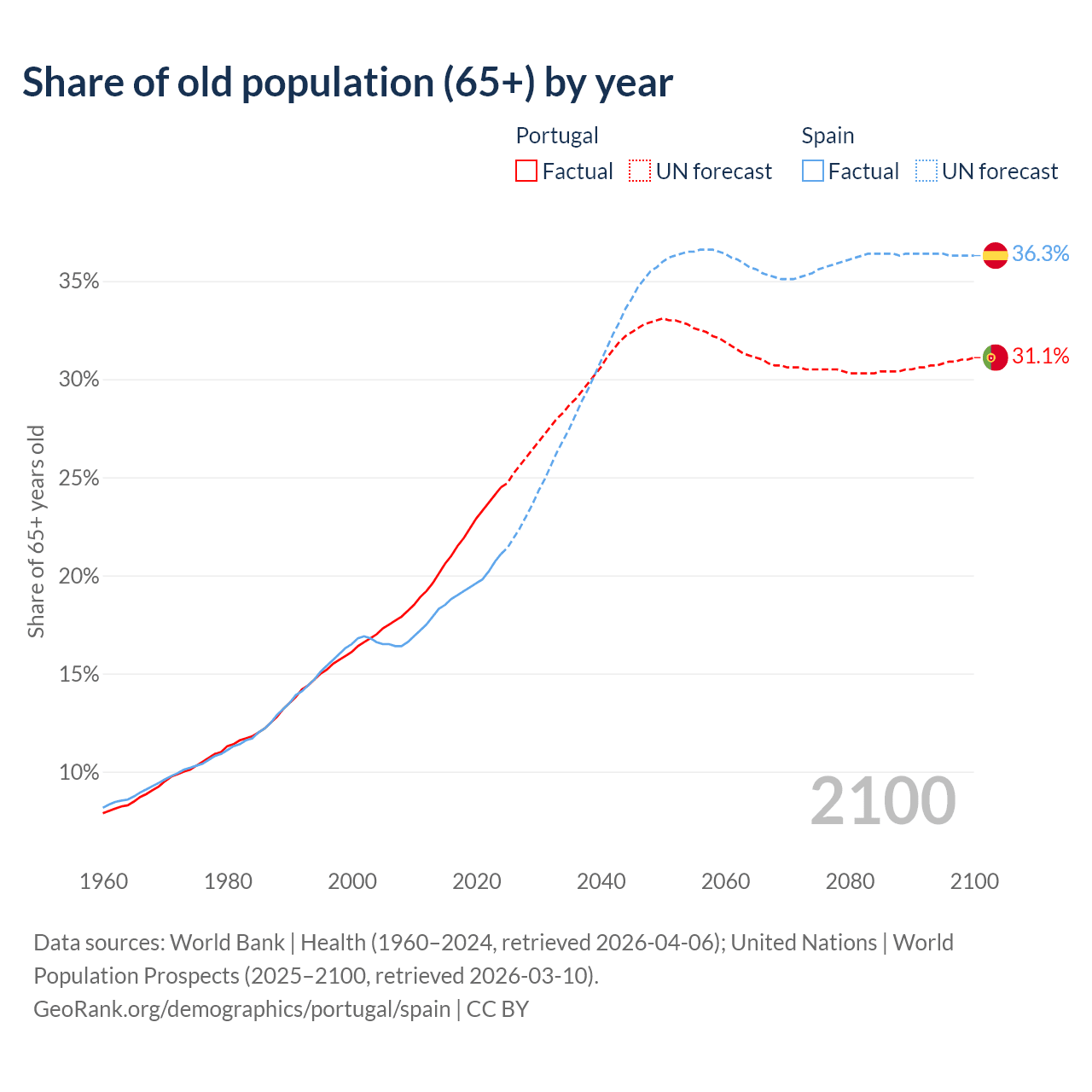 Median age Portugal vs Spain, 1960-2100