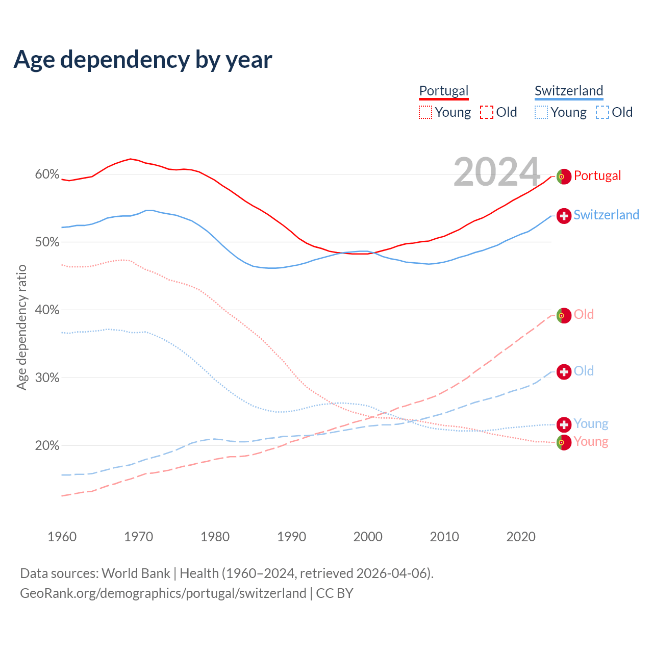 Data sources: World Bank | Health (1960–2024, retrieved 2026-04-06); U.S. Census Bureau (1960–2024, retrieved 2026-02-08).