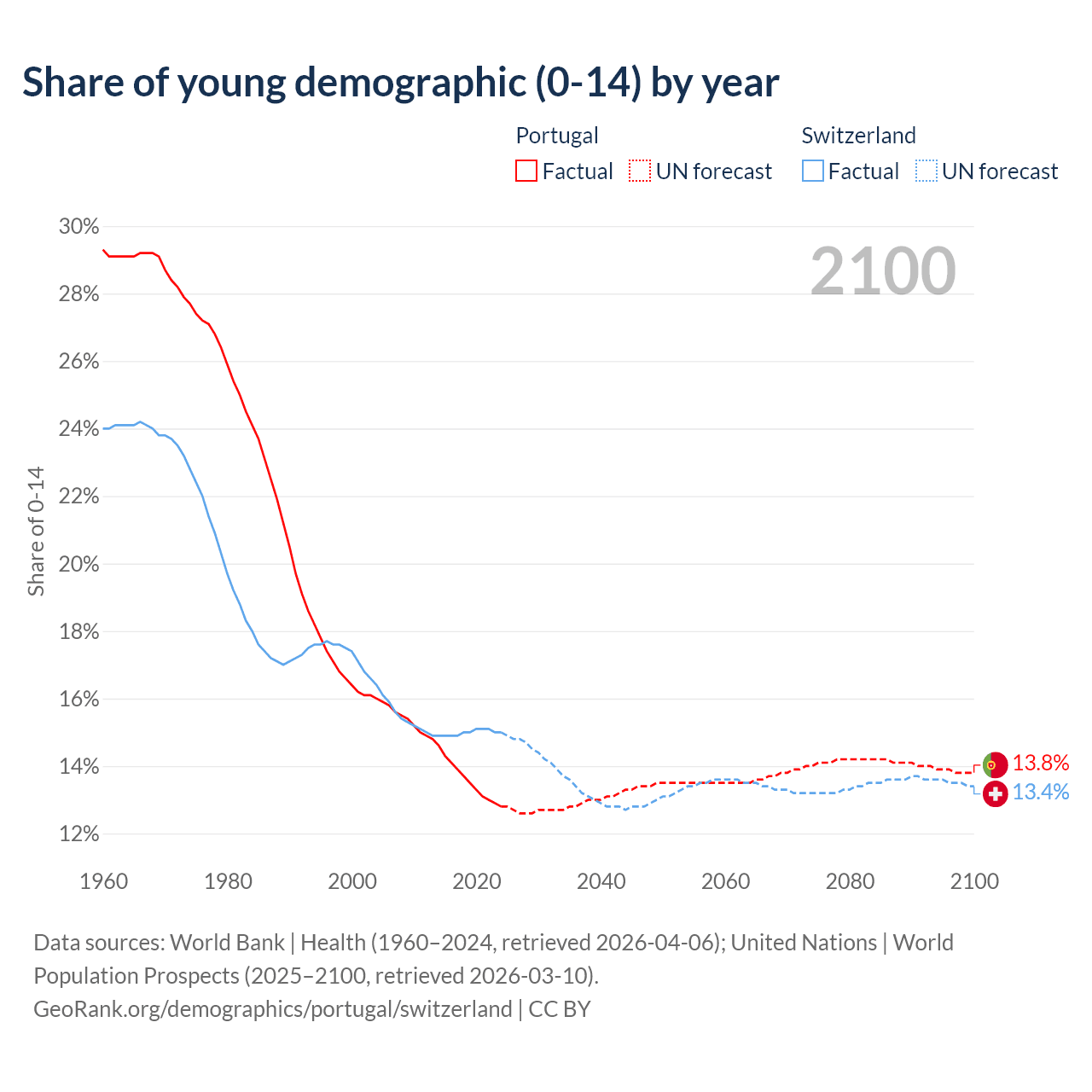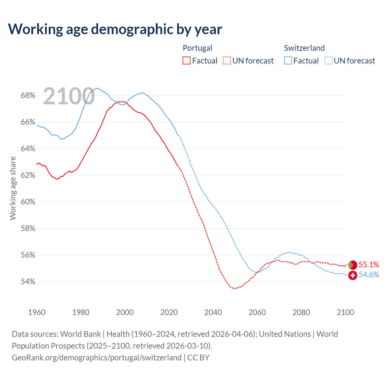 Median age Portugal vs Switzerland, 1960-2100
