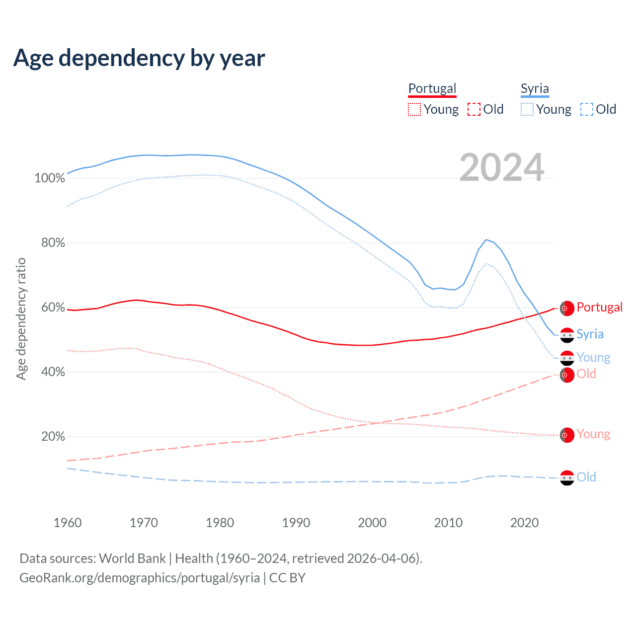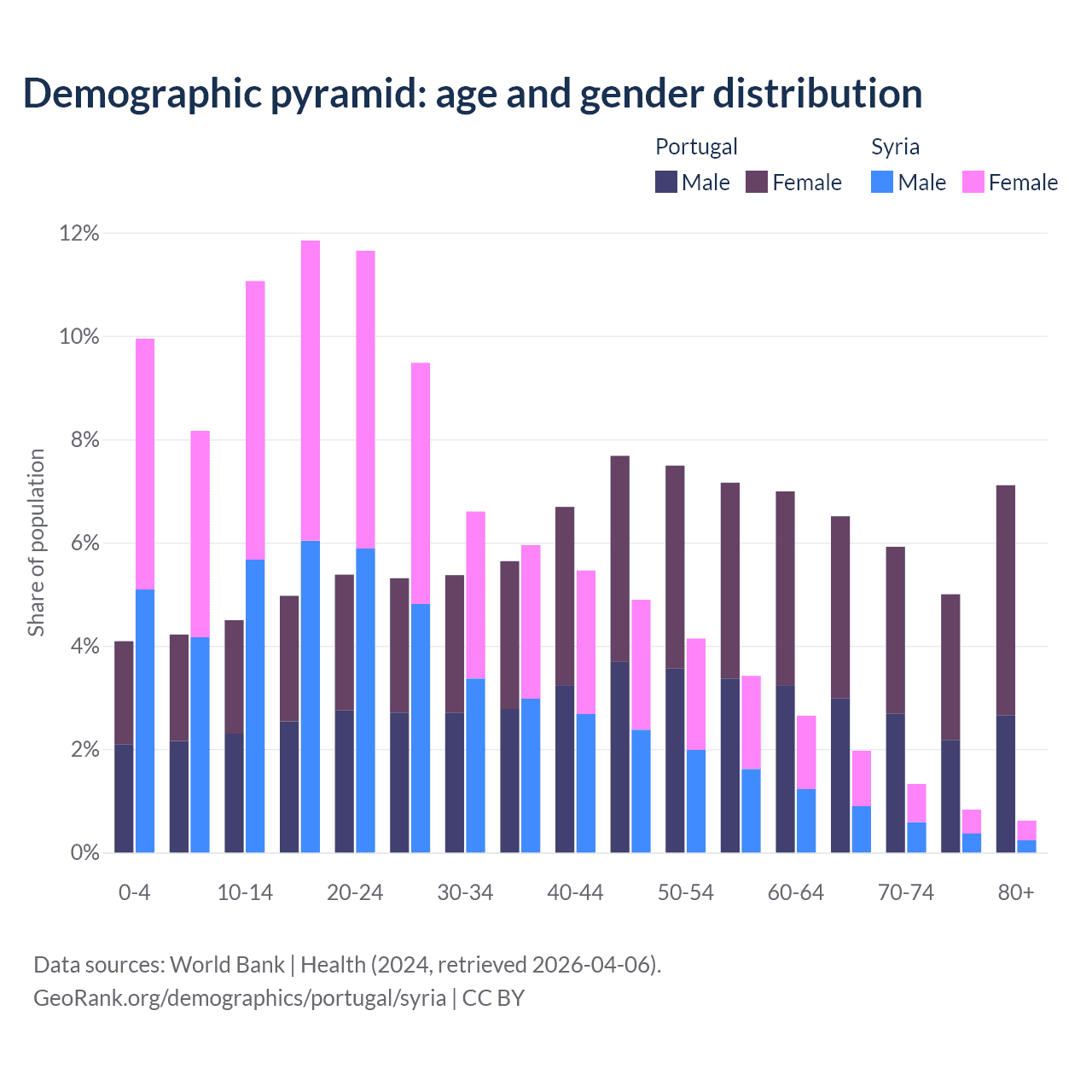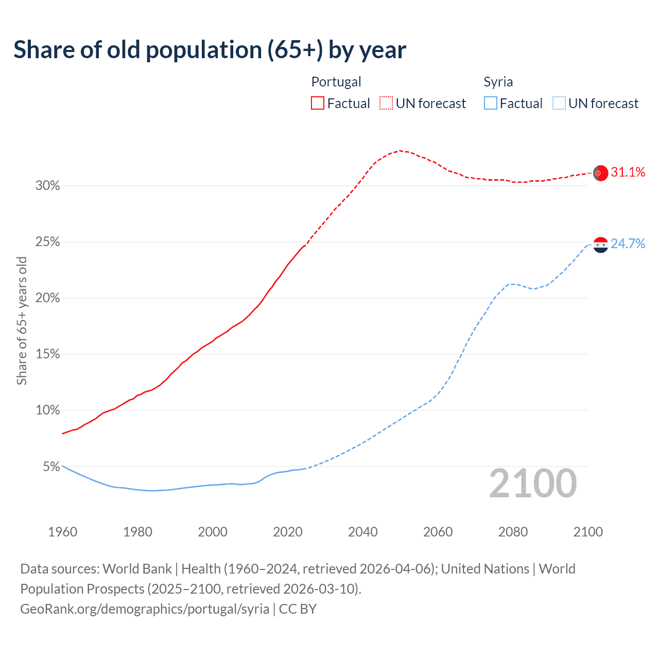 The share of older people aged 65 and over is 24.5% in Portugal and 4.74% in Syria. Life expectancy in Portugal compared to Syria .