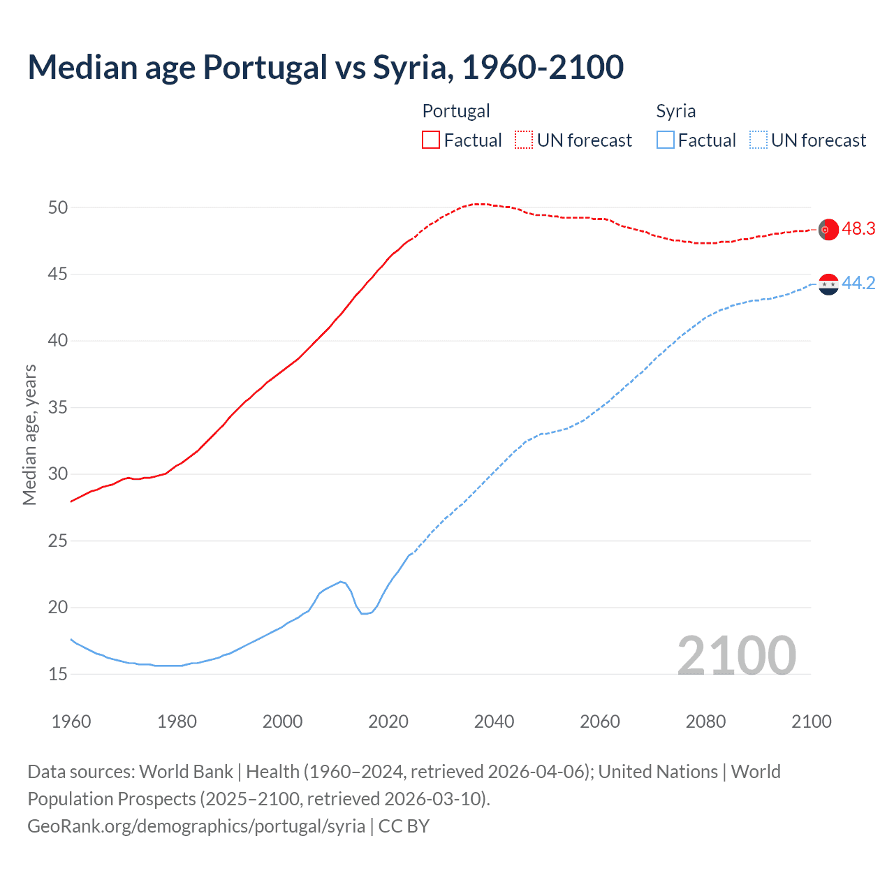 - The median age in Portugal is 47.5 years compared to 23.9 years in Syria.