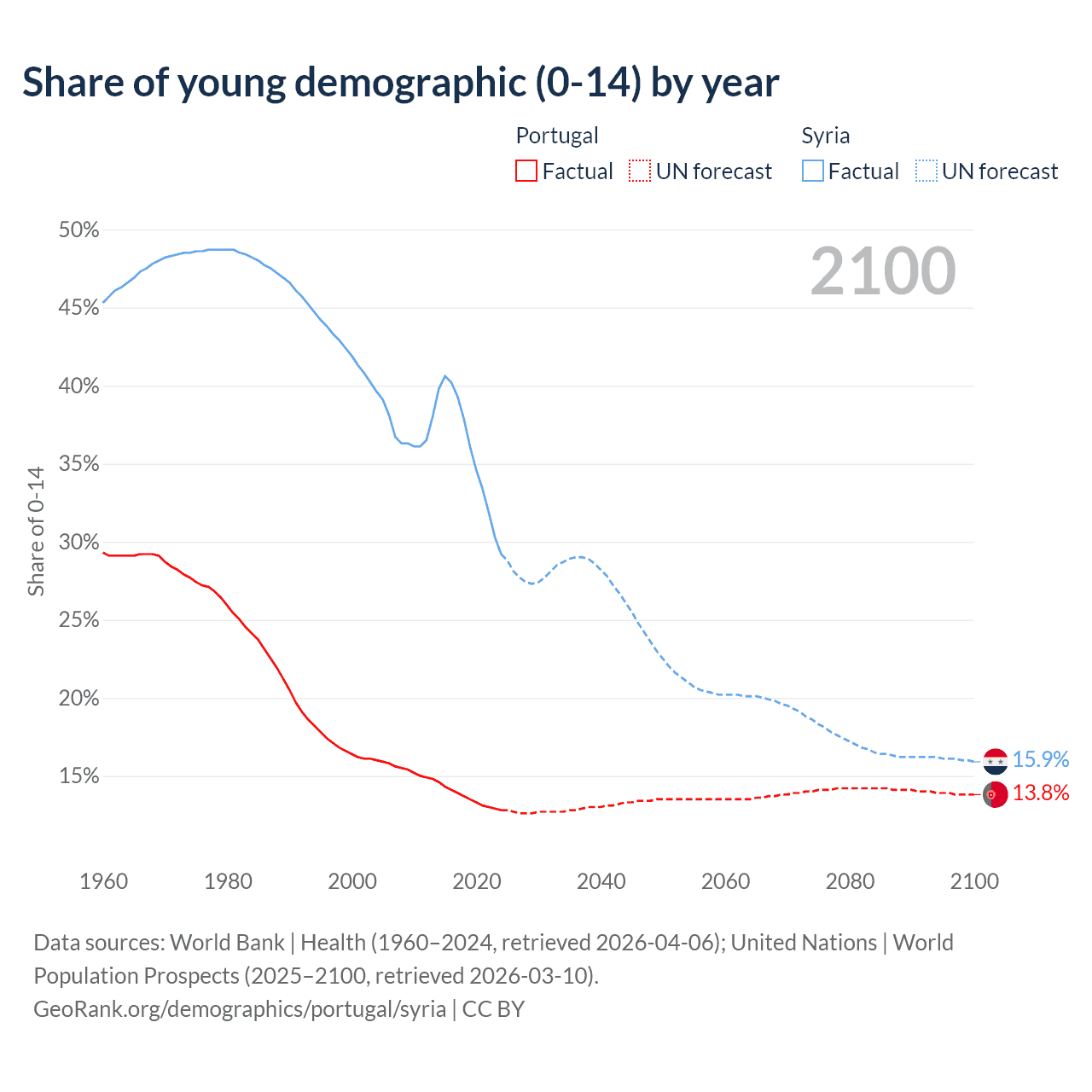 - The share of young demographic (0-15 years old) in Portugal is 12.8% vs 29.2% in Syria.