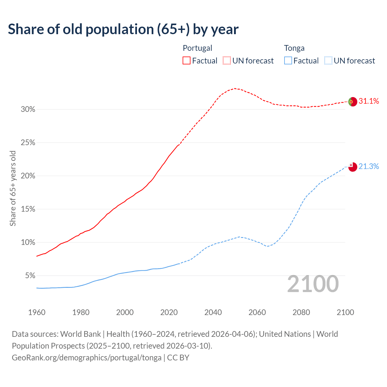 The share of older people aged 65 and over is 24.5% in Portugal and 6.72% in Tonga. Life expectancy in Portugal compared to Tonga .