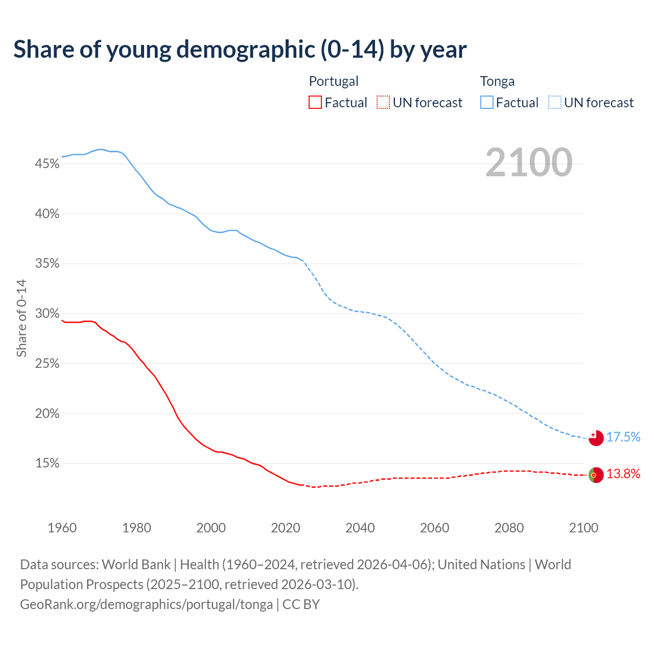 - The share of young demographic (0-15 years old) in Portugal is 12.8% vs 35.4% in Tonga.