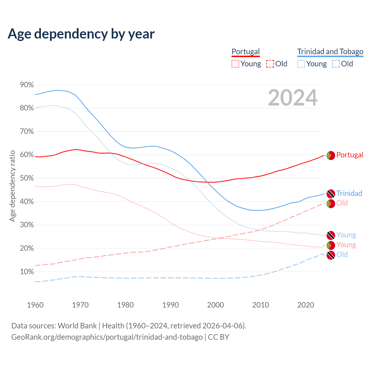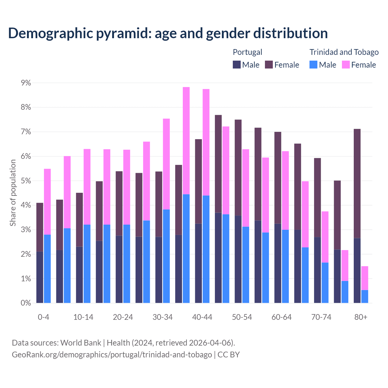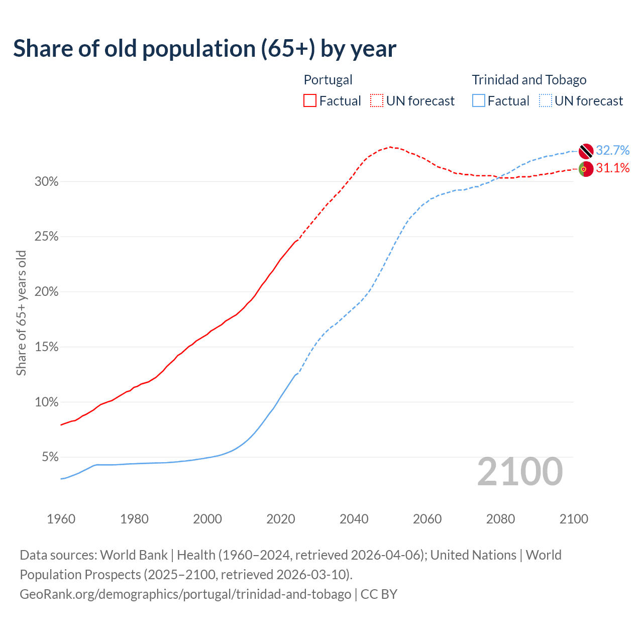 The share of older people aged 65 and over is 24.5% in Portugal and 12.4% in Trinidad and Tobago. Life expectancy in Portugal compared to Trinidad and Tobago .