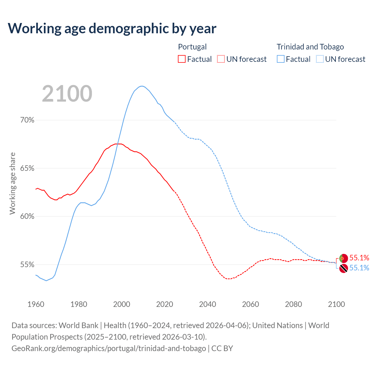 Median age Portugal vs Trinidad and Tobago, 1960-2100