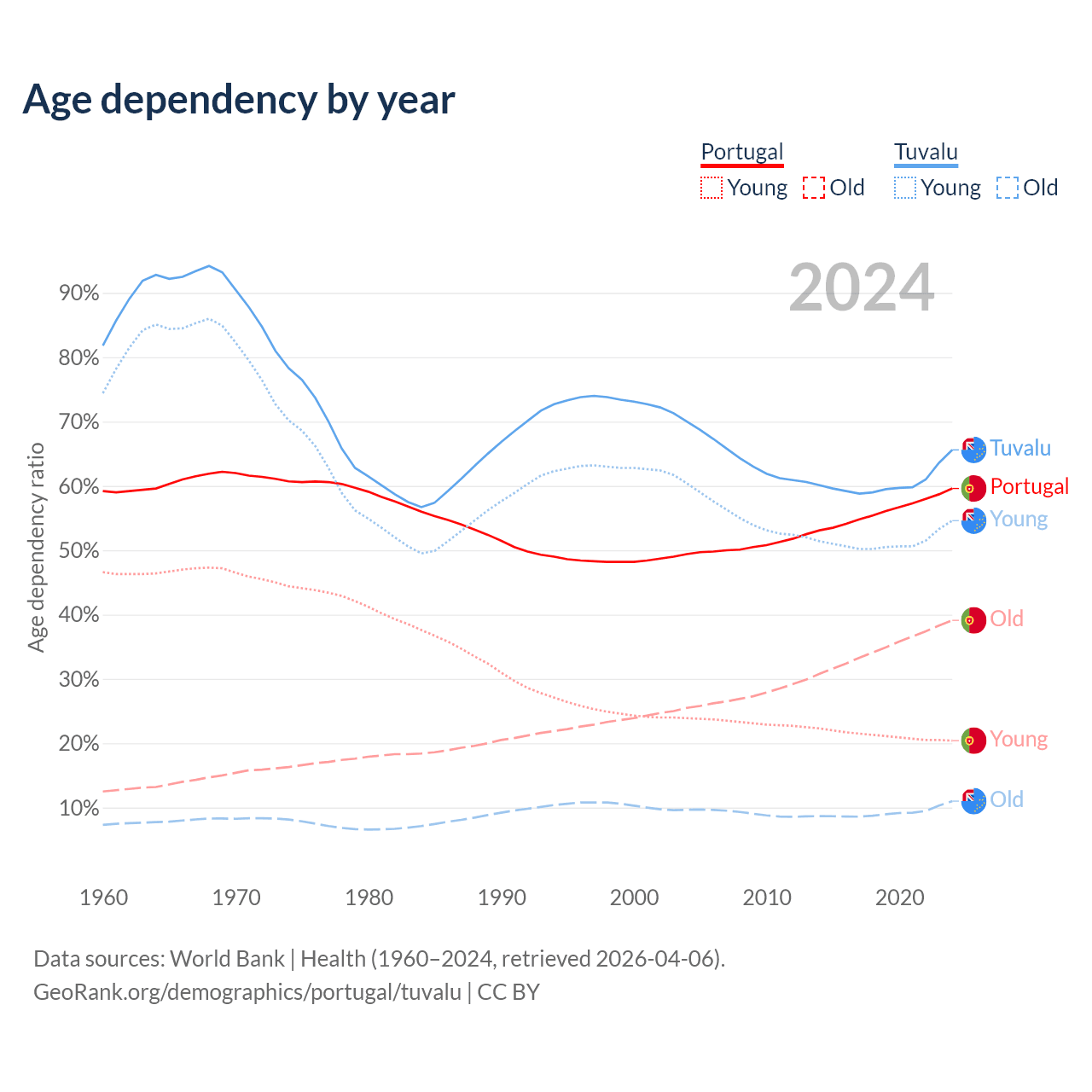 - The share of old-age demographic (65+) in Portugal is 24.5% vs 6.67% in Tuvalu.