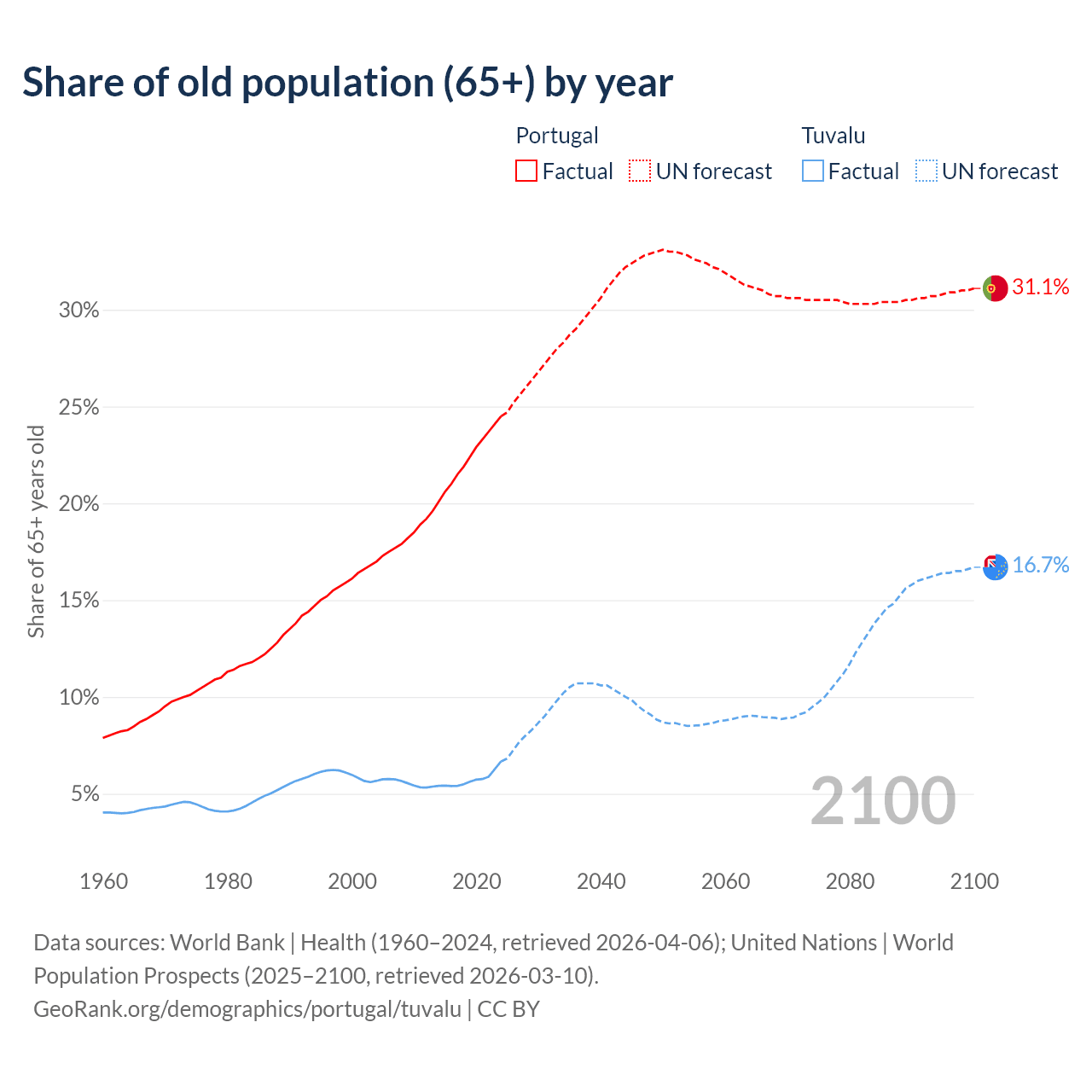 The share of older people aged 65 and over is 24.5% in Portugal and 6.67% in Tuvalu. Life expectancy in Portugal compared to Tuvalu .