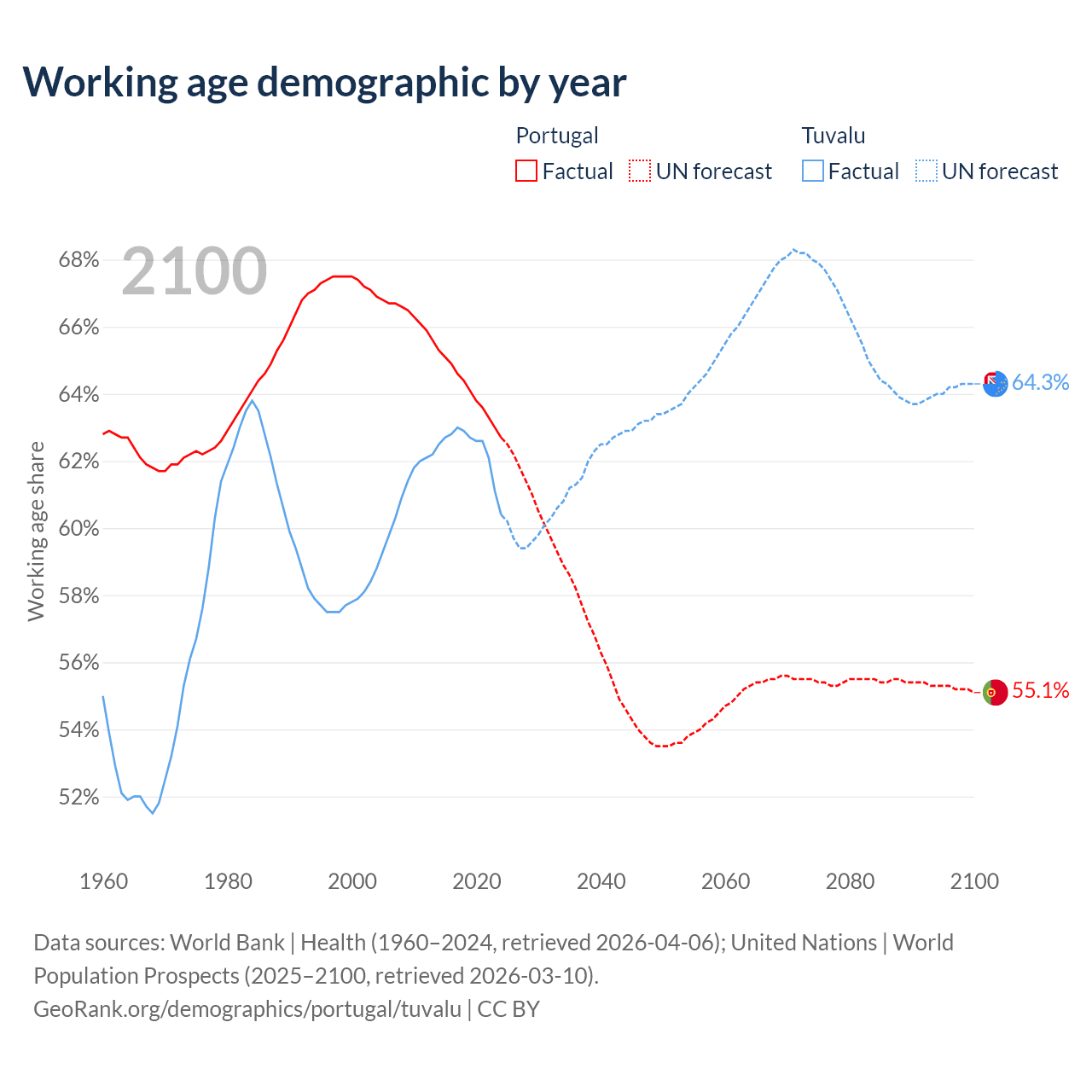 Median age Portugal vs Tuvalu, 1960-2100