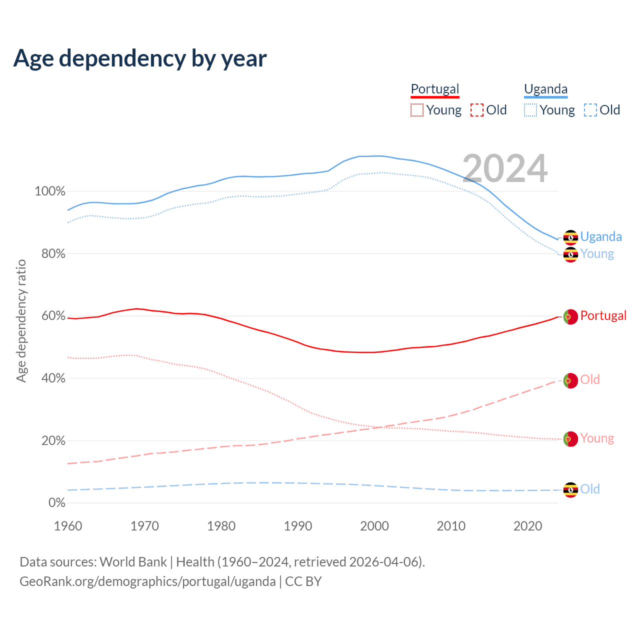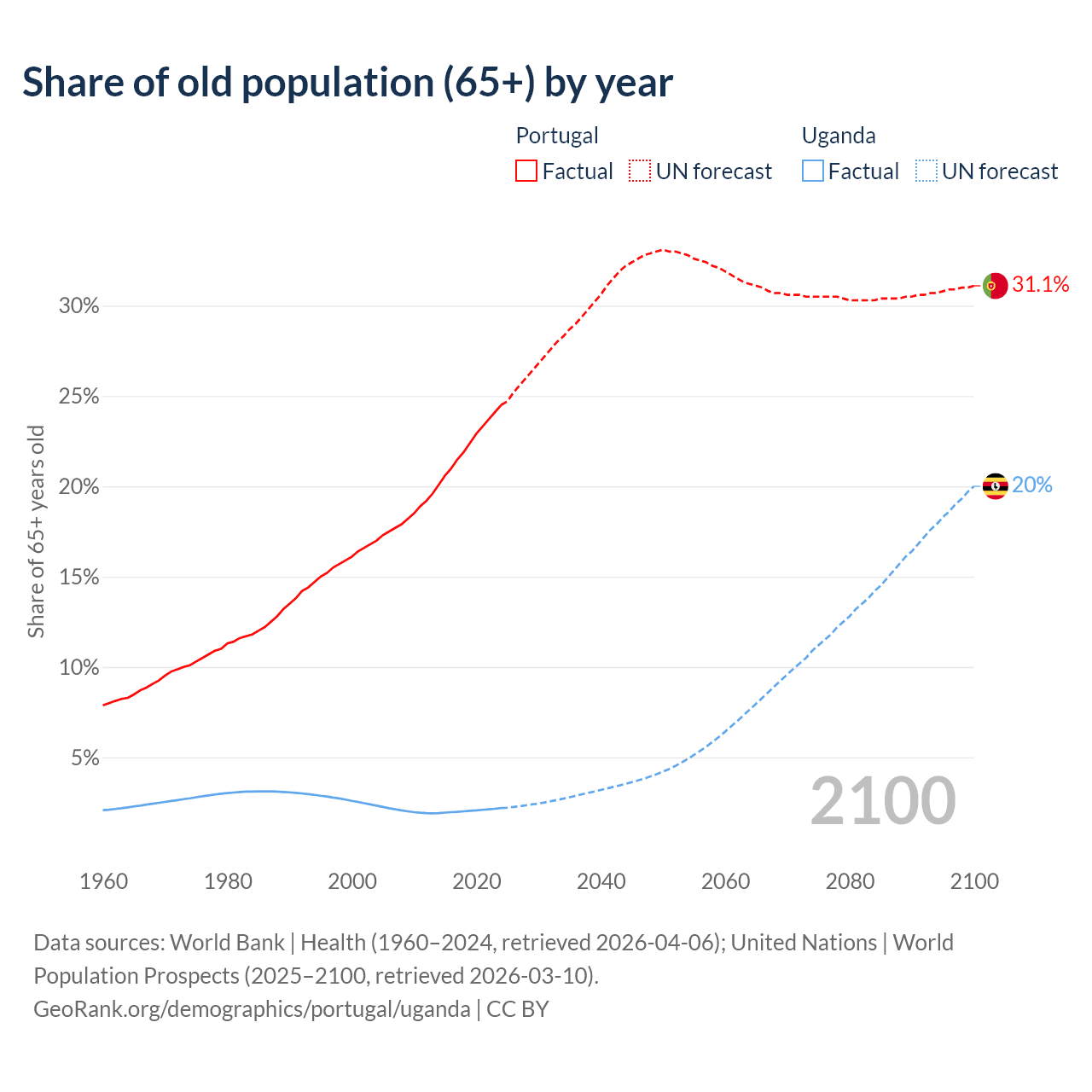 The share of older people aged 65 and over is 24.5% in Portugal and 2.19% in Uganda. Life expectancy in Portugal compared to Uganda .