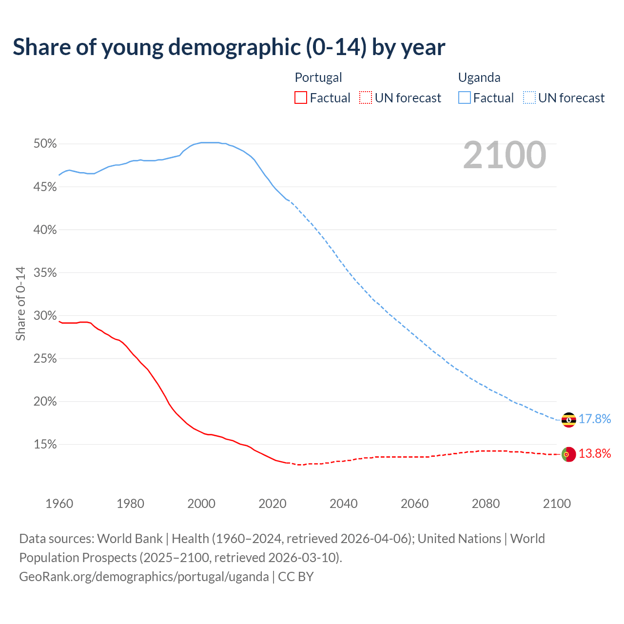 - The share of young demographic (0-15 years old) in Portugal is 12.8% vs 43.5% in Uganda.