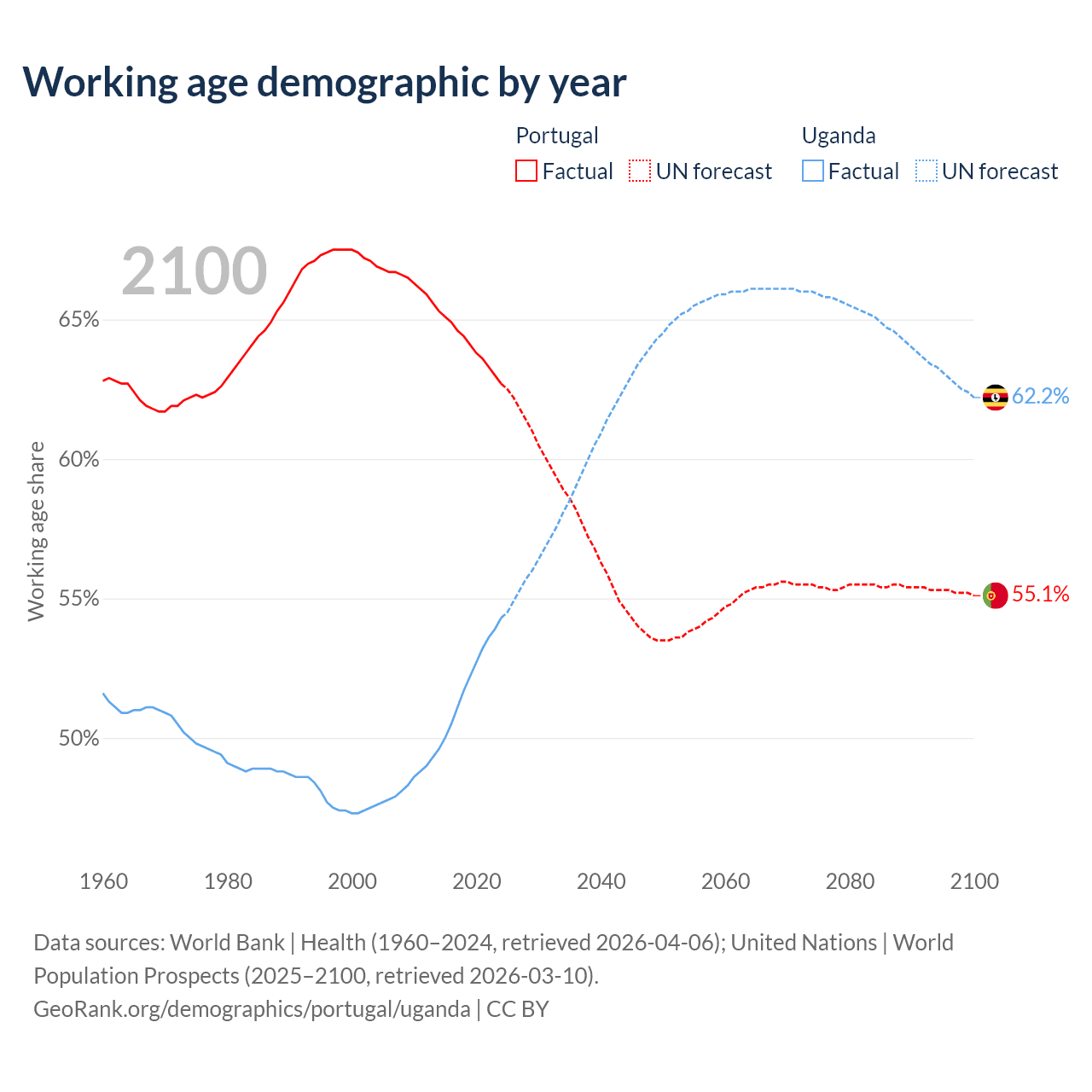 Median age Portugal vs Uganda, 1960-2100