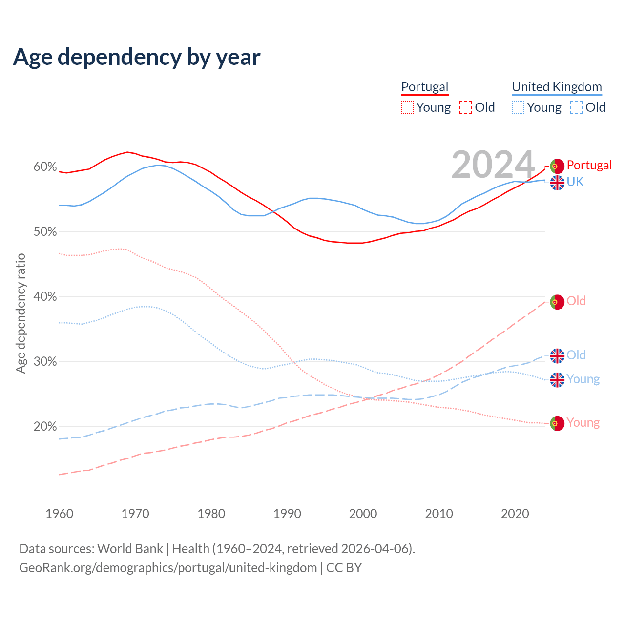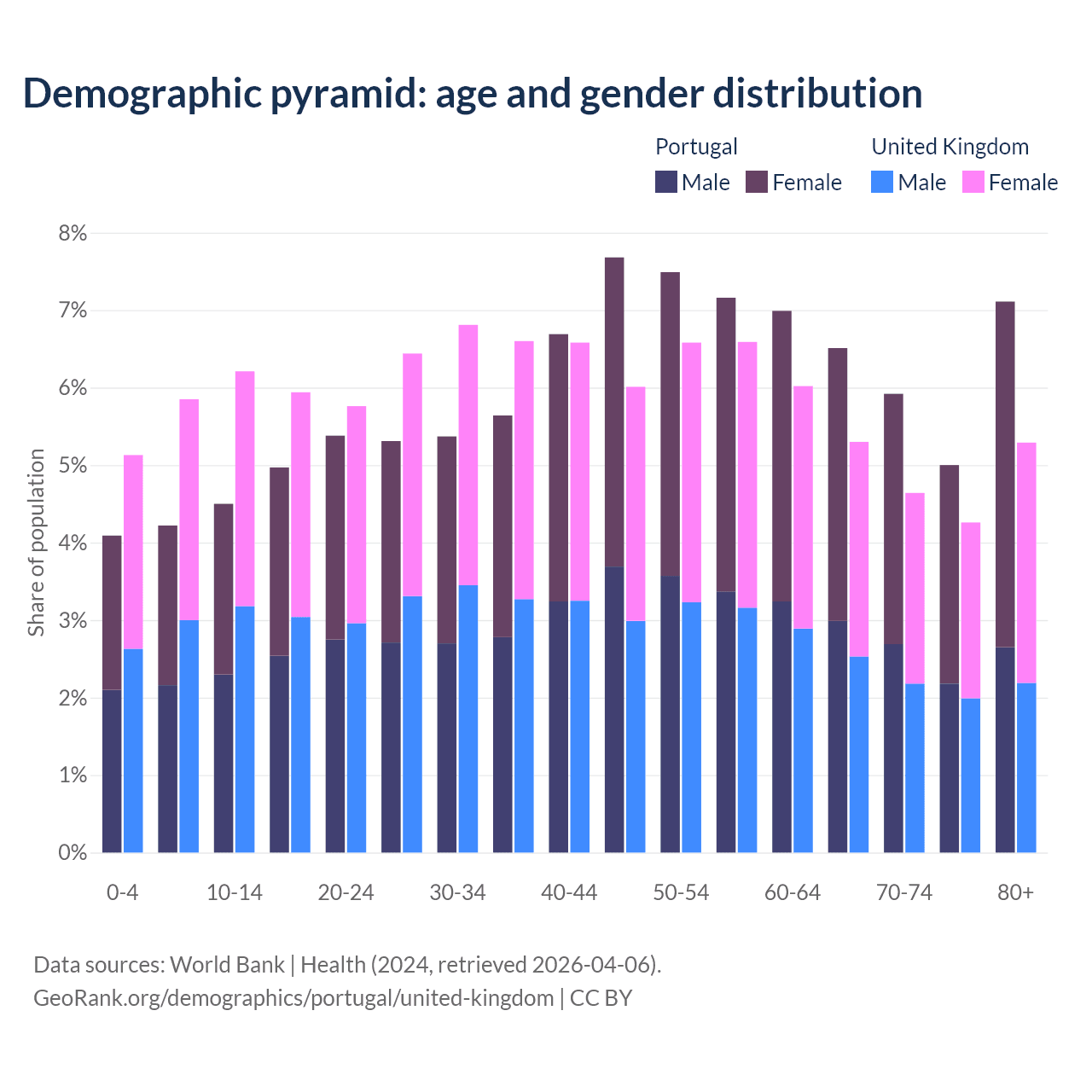- Portugal is ranked 5/196 by median age (oldest to youngest) vs 41/196 for the United Kingdom.