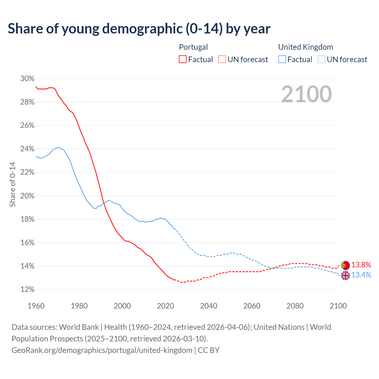 - The share of young demographic (0-15 years old) in Portugal is 12.8% vs 17.2% in the United Kingdom.