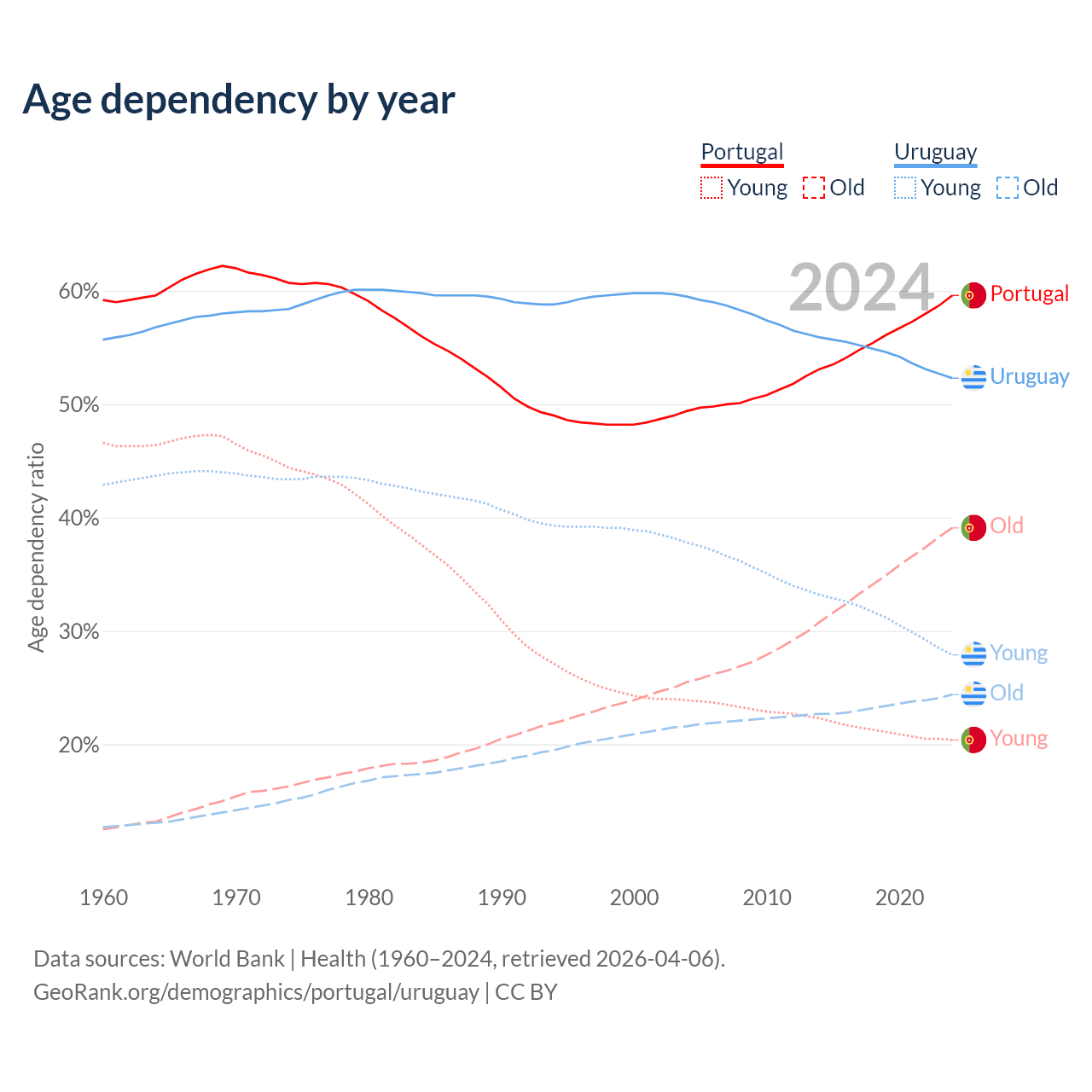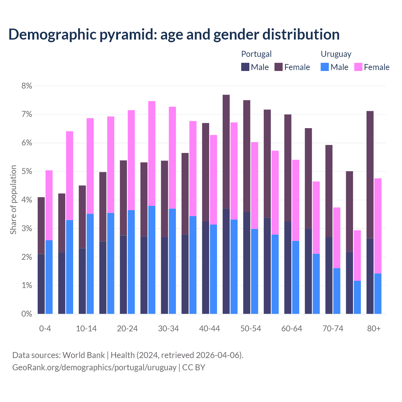 The share of older people aged 65 and over is 24.5% in Portugal and 16% in Uruguay. Life expectancy in Portugal compared to Uruguay .