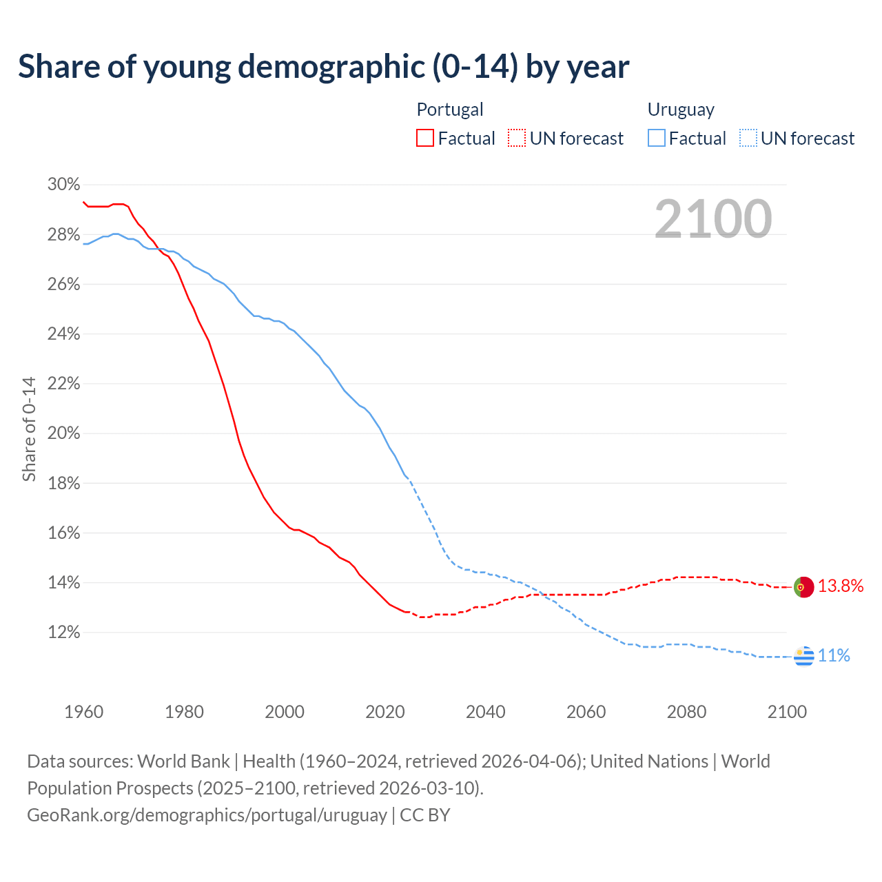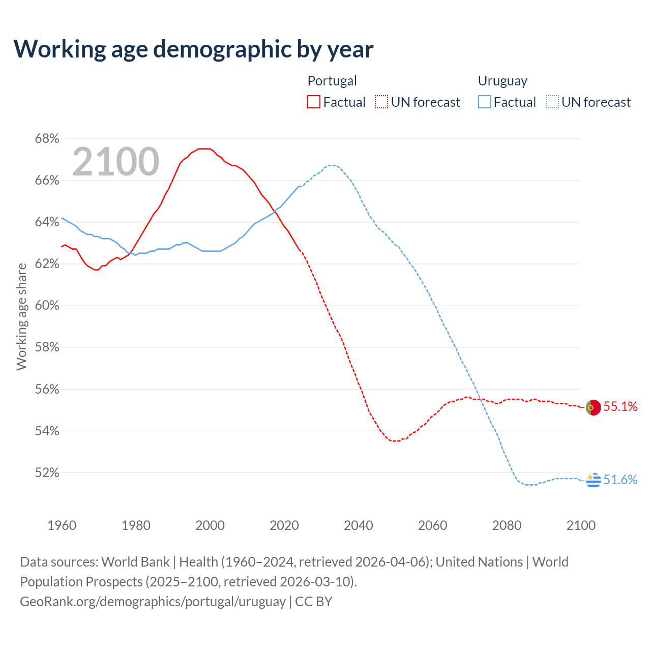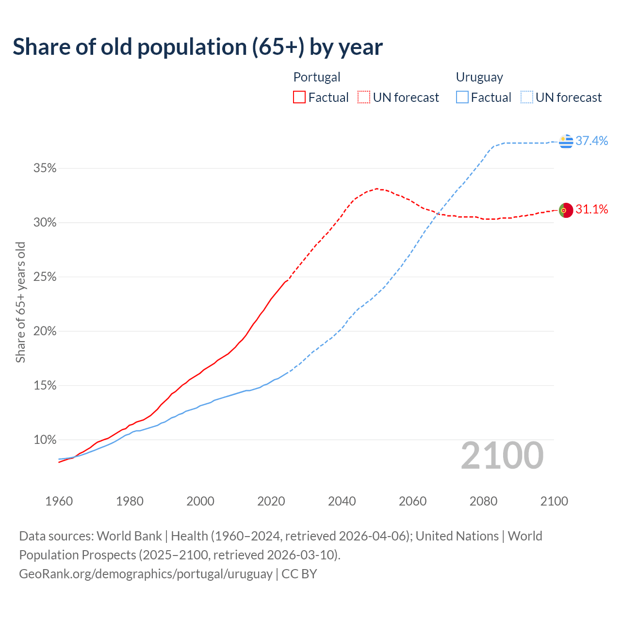 Median age Portugal vs Uruguay, 1960-2100