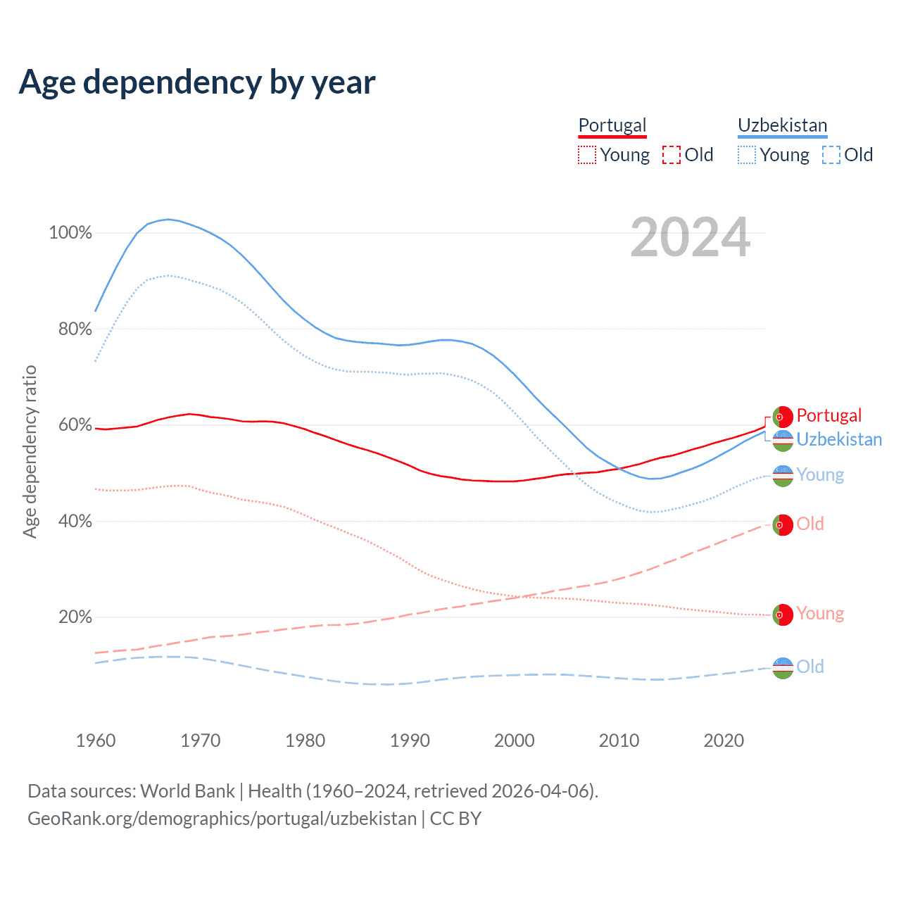 - Portugal is ranked 5/196 by median age (oldest to youngest) vs 116/196 for Uzbekistan.