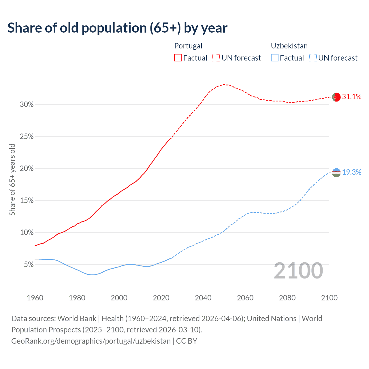 The share of older people aged 65 and over is 24.5% in Portugal and 5.86% in Uzbekistan. Life expectancy in Portugal compared to Uzbekistan .