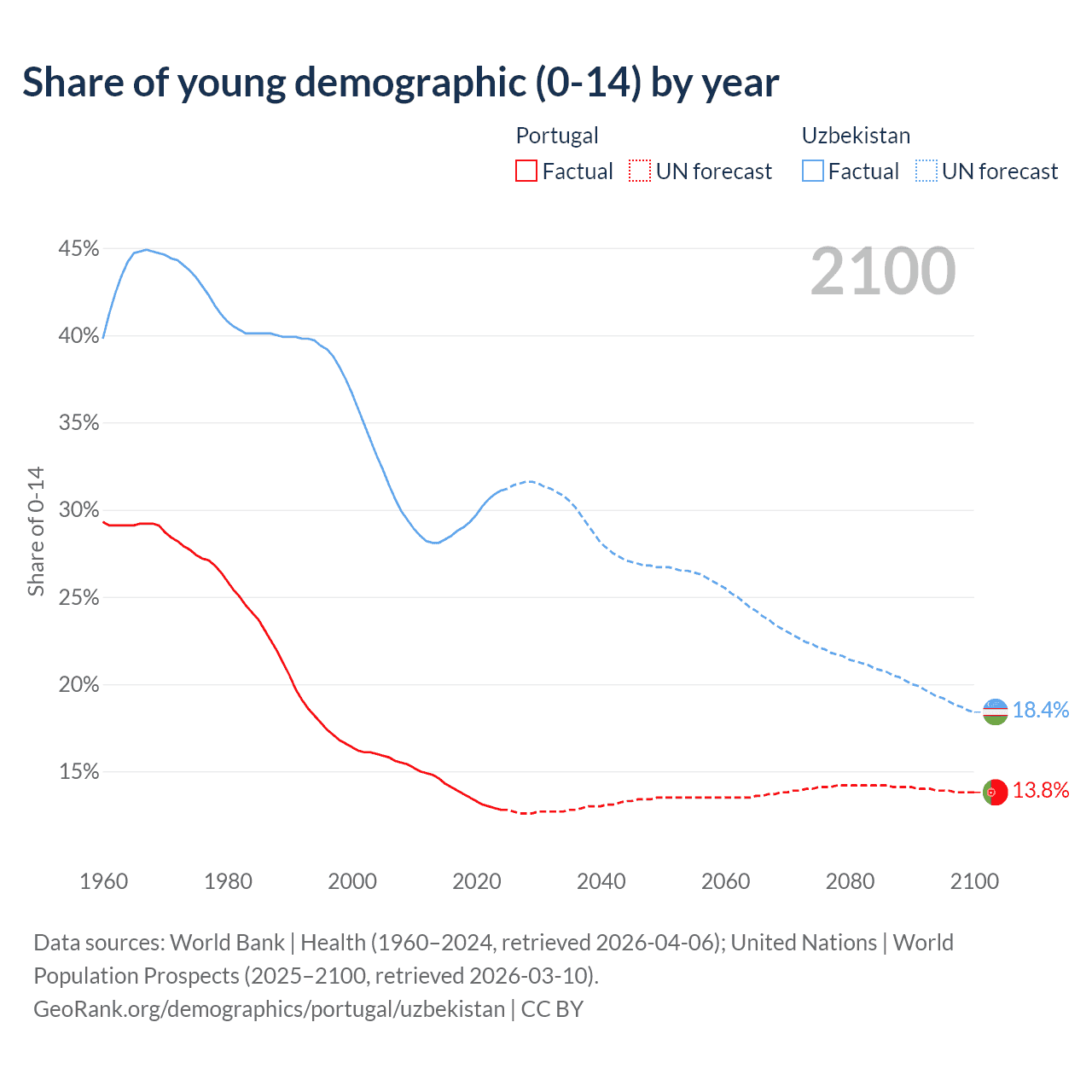- The share of young demographic (0-15 years old) in Portugal is 12.8% vs 31.1% in Uzbekistan.