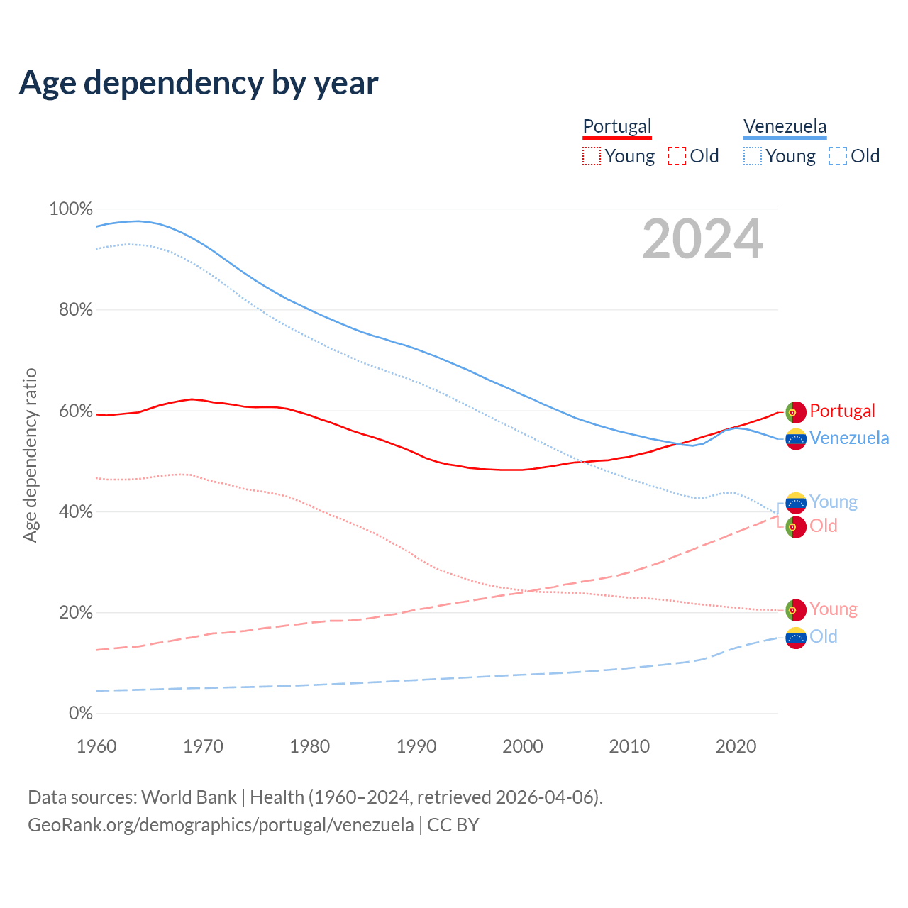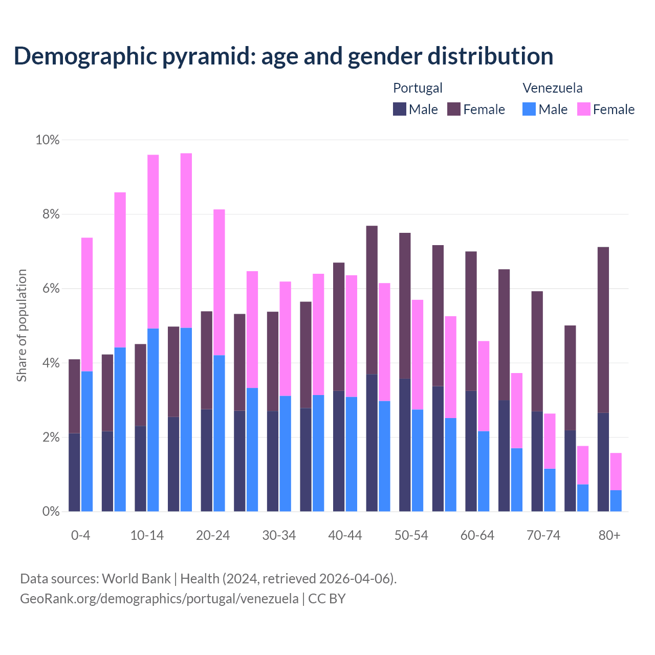 - Portugal is ranked 5/196 by median age (oldest to youngest) vs 104/196 for Venezuela.