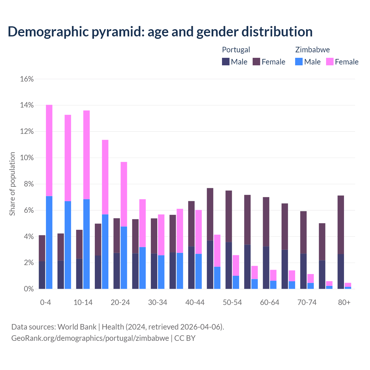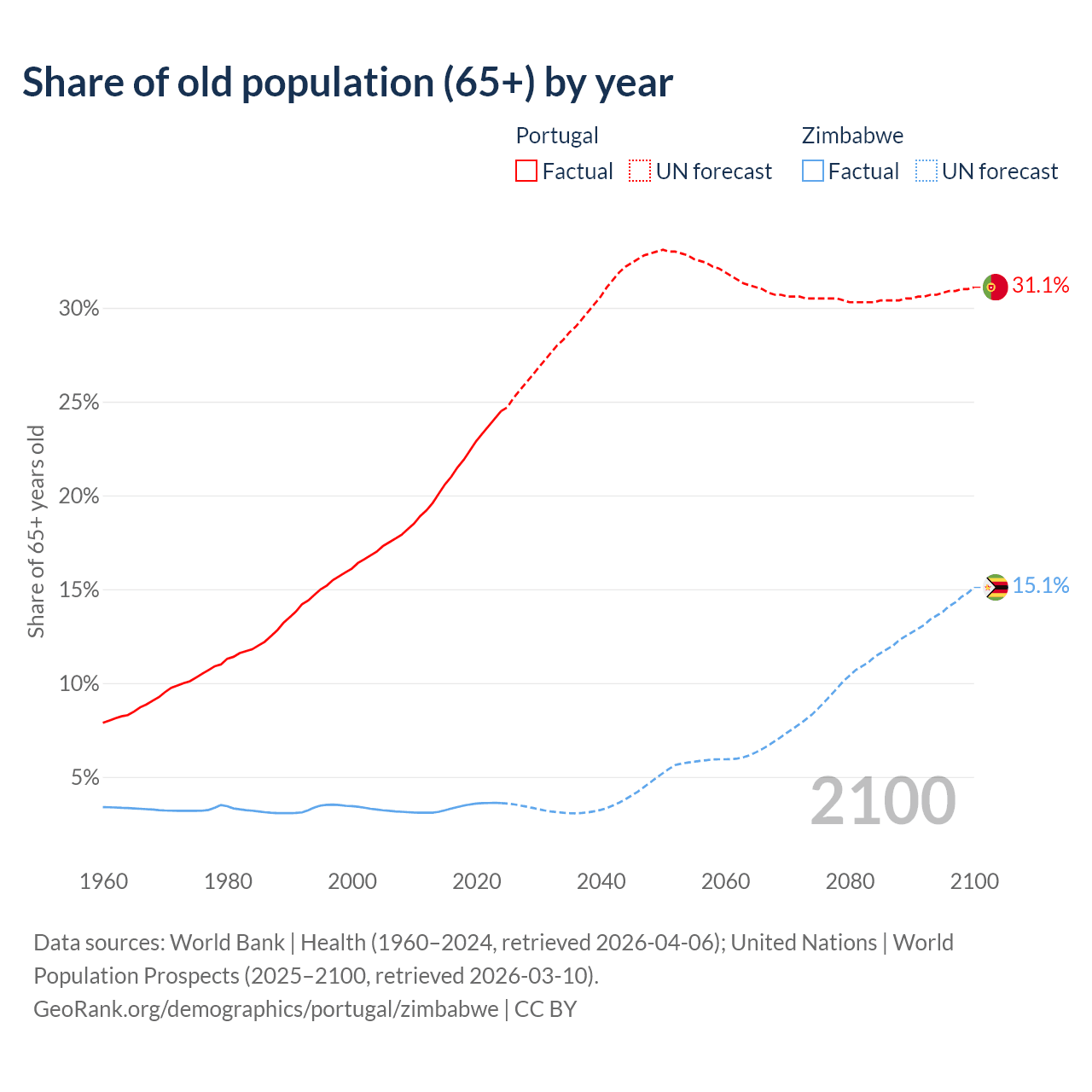 The share of older people aged 65 and over is 24.5% in Portugal and 3.6% in Zimbabwe. Life expectancy in Portugal compared to Zimbabwe .