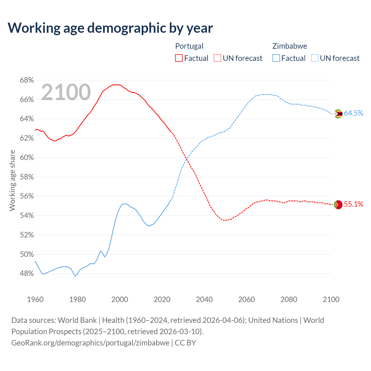 Median age Portugal vs Zimbabwe, 1960-2100